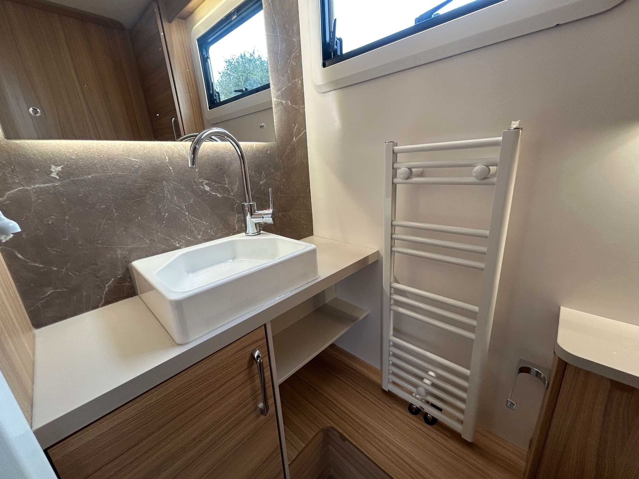 Step into luxury with a rear forward-facing island bed, creating a cosy retreat at the end of each day's adventures. Adjoining wardrobes on either side of the bed offer ample storage space for all your belongings, while an adjacent TV display point ensures entertainment is always within reach.