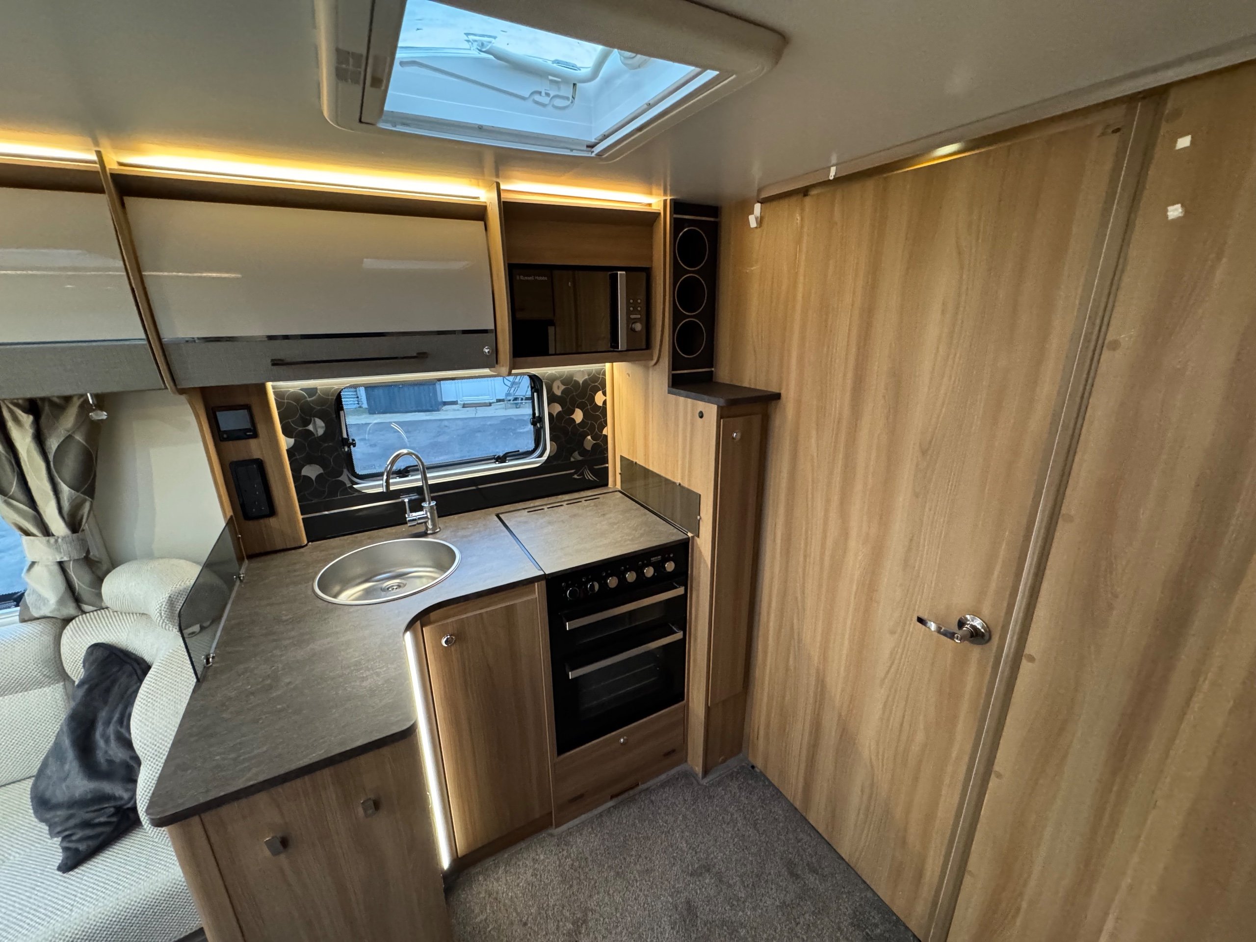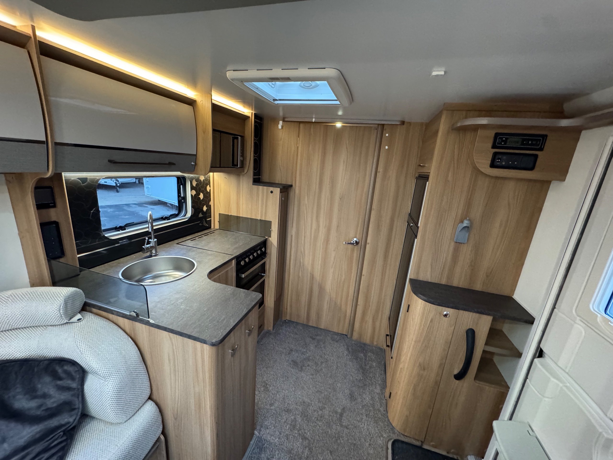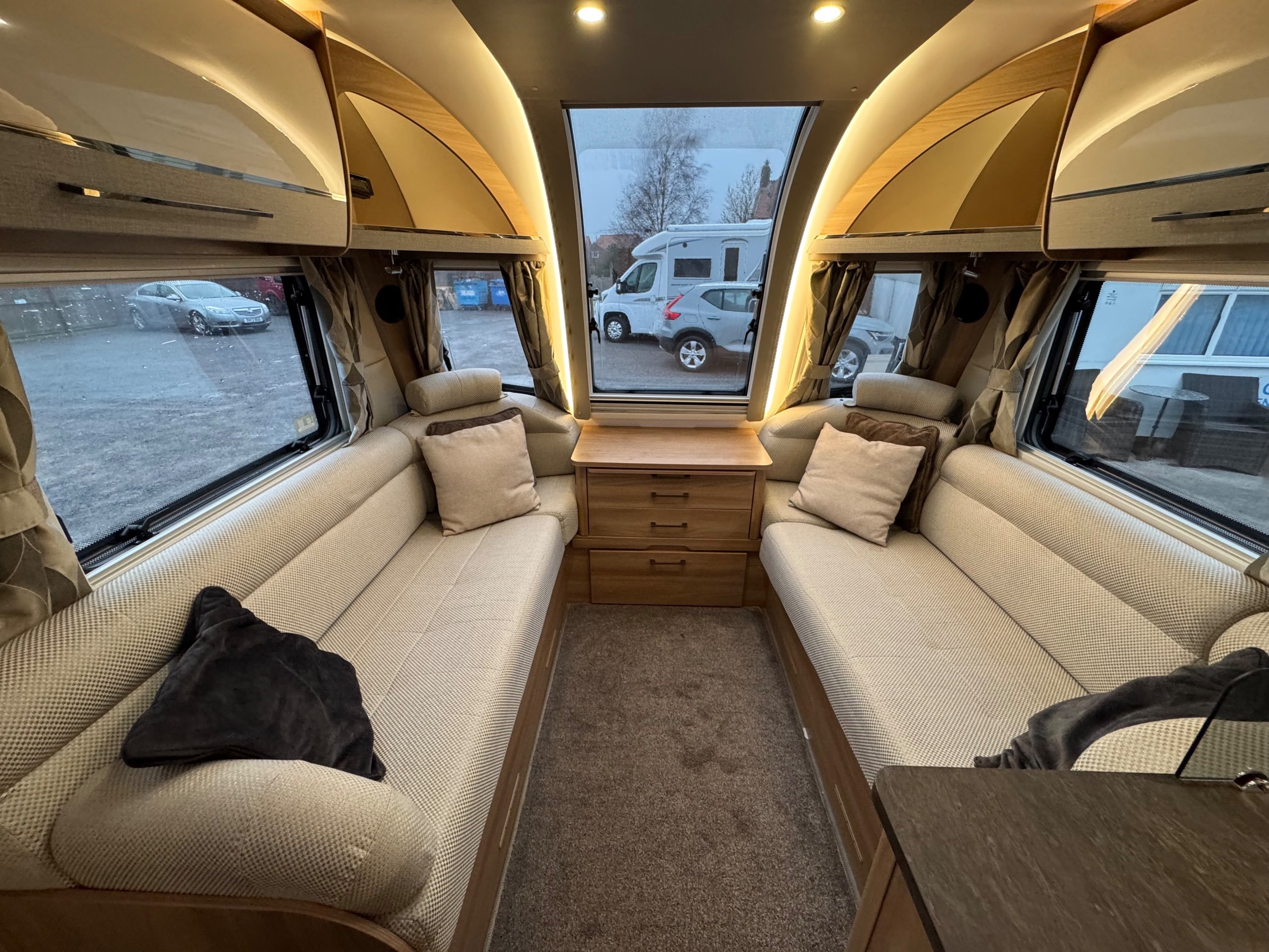 Rear bedroom incorporating central island bed and adjoining wardrobes - central dressing room with individual shower cubicle , vanity unit and toilet - central offside kitchen - double dinette / lounge area at the front . This luxurious and spacious caravan is designed with comfort and style in mind, The Porto is equipped with modern amenities, including a fully functional kitchen with state-of-the-art appliances, and a cozy lounge area ideal for relaxing after a long day on the road. With its sleek exterior and high-quality construction, the Bailey Alicanto Grande Porto is the perfect choice for those who value both comfort and elegance while on the move. Whether you're planning a weekend getaway or a long road trip, this caravan is sure to exceed your expectations and provide you with a memorable travel experience.