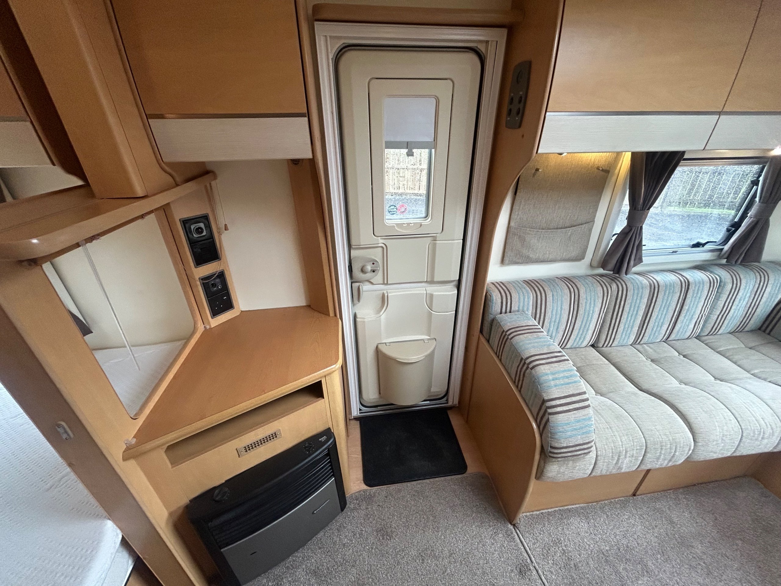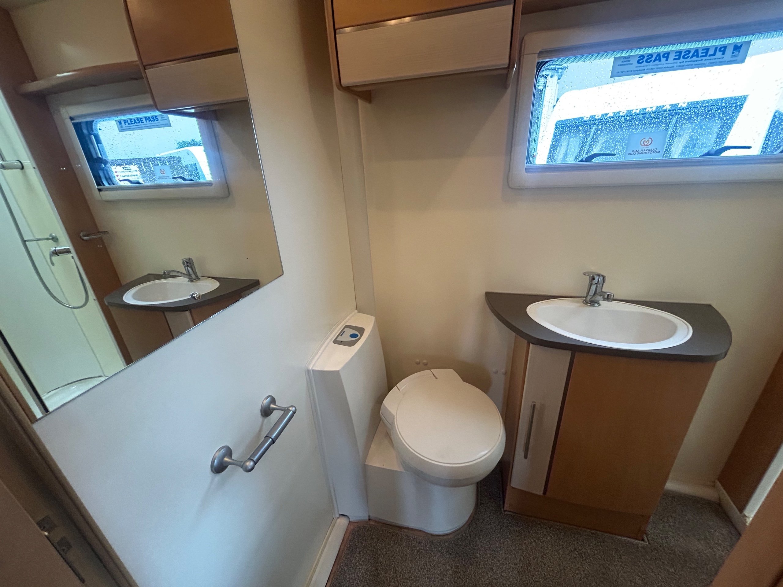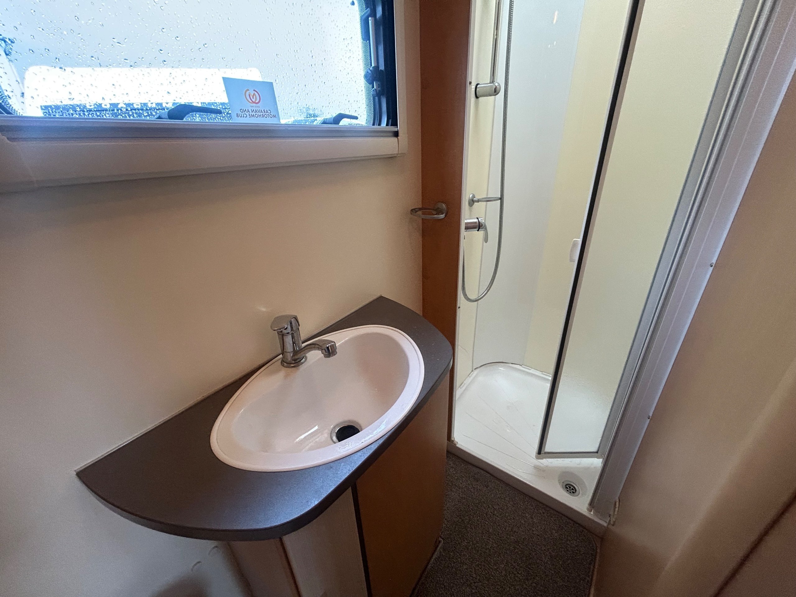 Complete end washroom incorporating separate shower cubicle, vanity unit and toilet - nearside fixed double bed with adjacent double wardrobe - central offside kitchen - central nearside dresser - 2 x singles / double at the front - a great example of this spacious tourer - offering a generous amount of floor space and storage as well as a very airy and solid feel