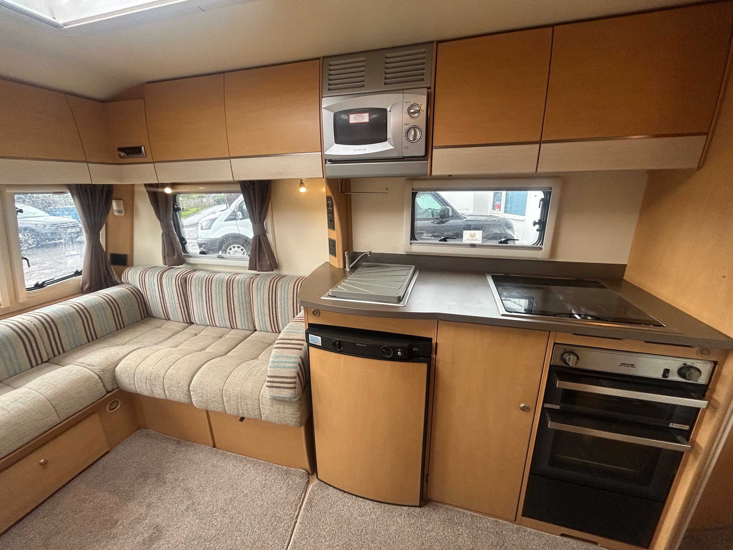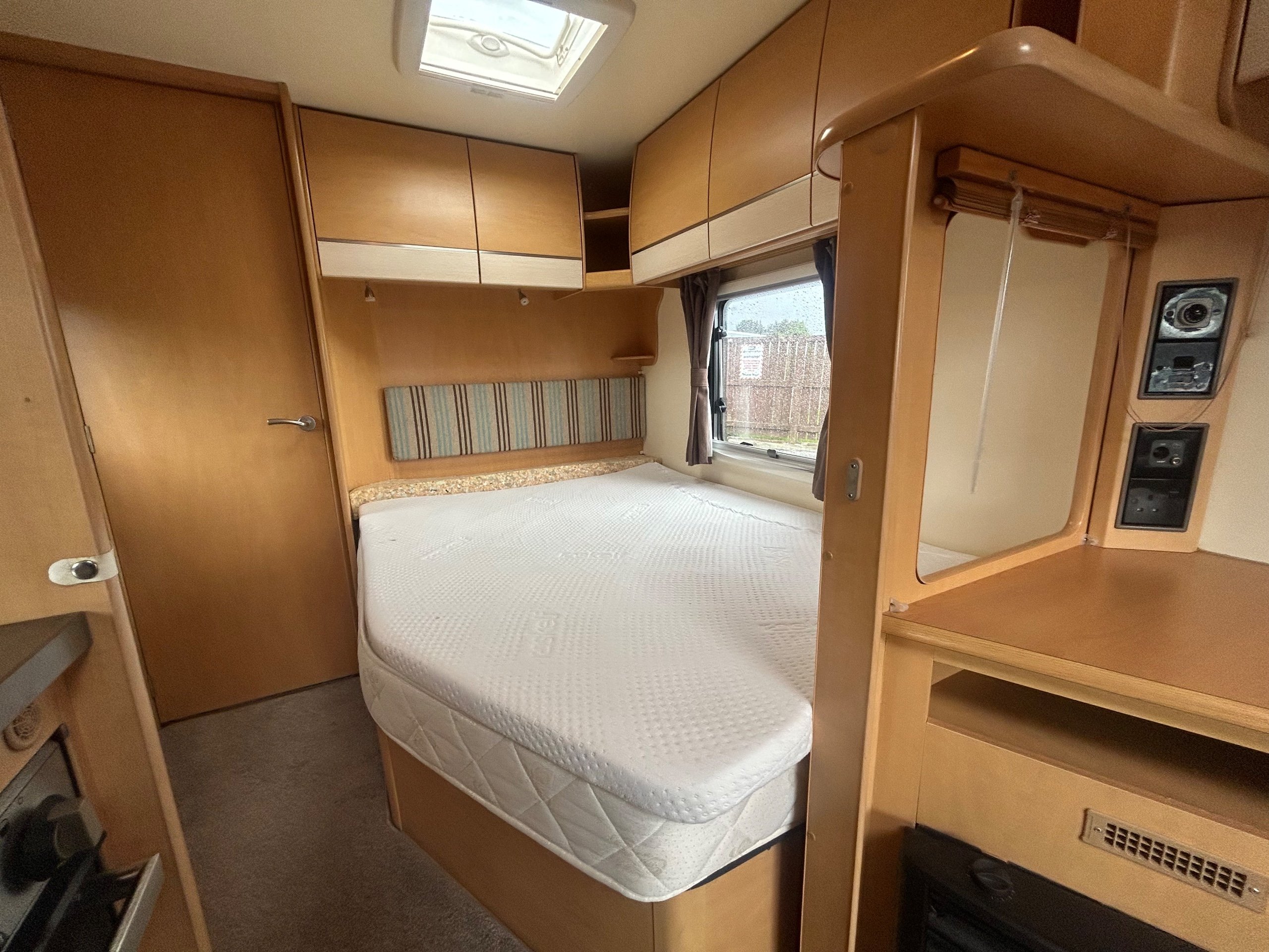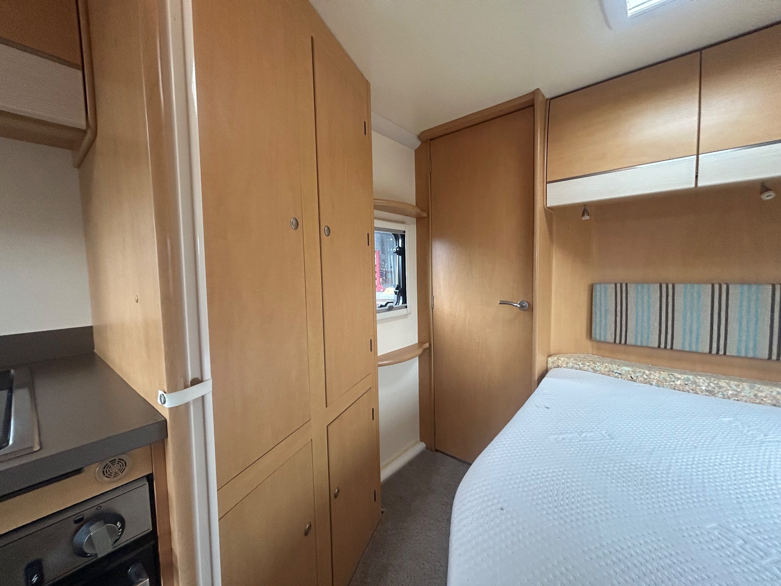 Complete end washroom incorporating separate shower cubicle, vanity unit and toilet - nearside fixed double bed with adjacent double wardrobe - central offside kitchen - central nearside dresser - 2 x singles / double at the front - a great example of this spacious tourer - offering a generous amount of floor space and storage as well as a very airy and solid feel