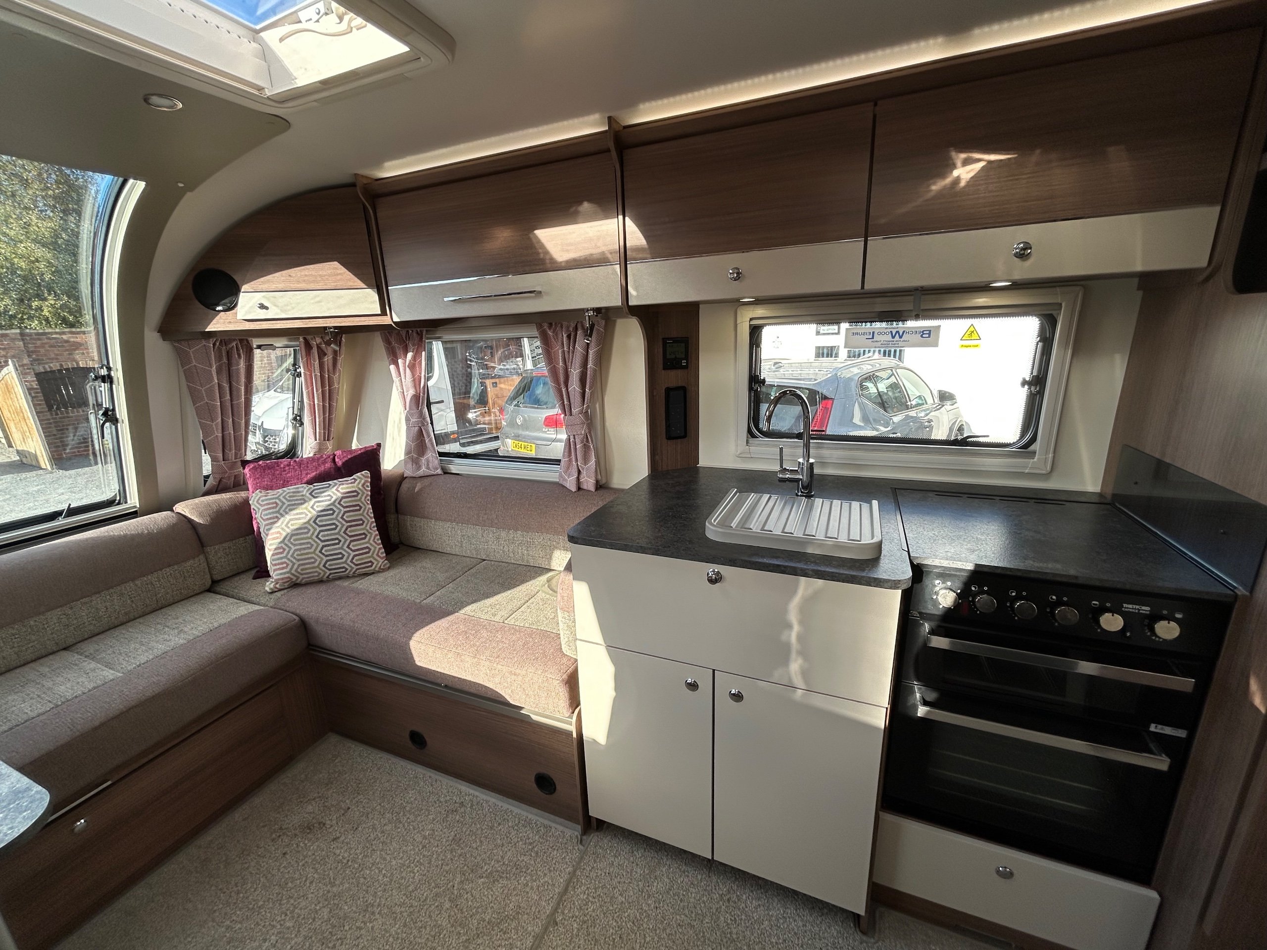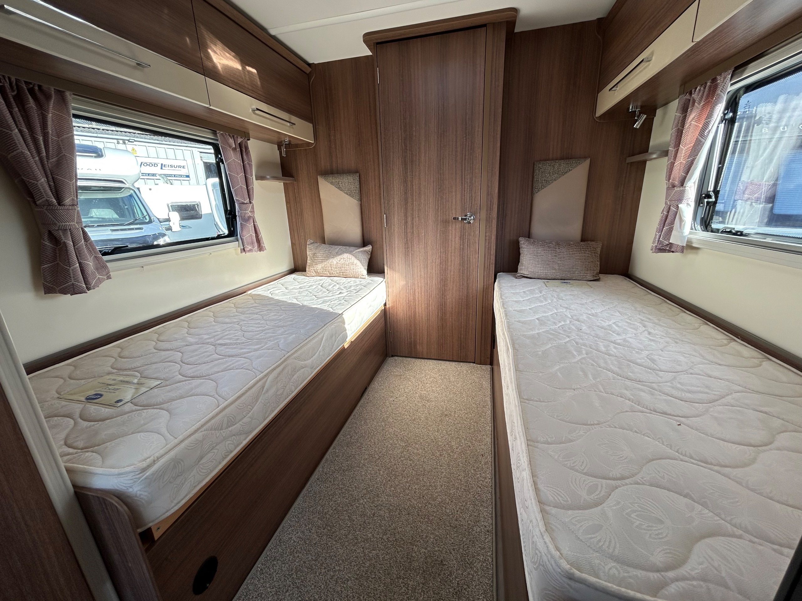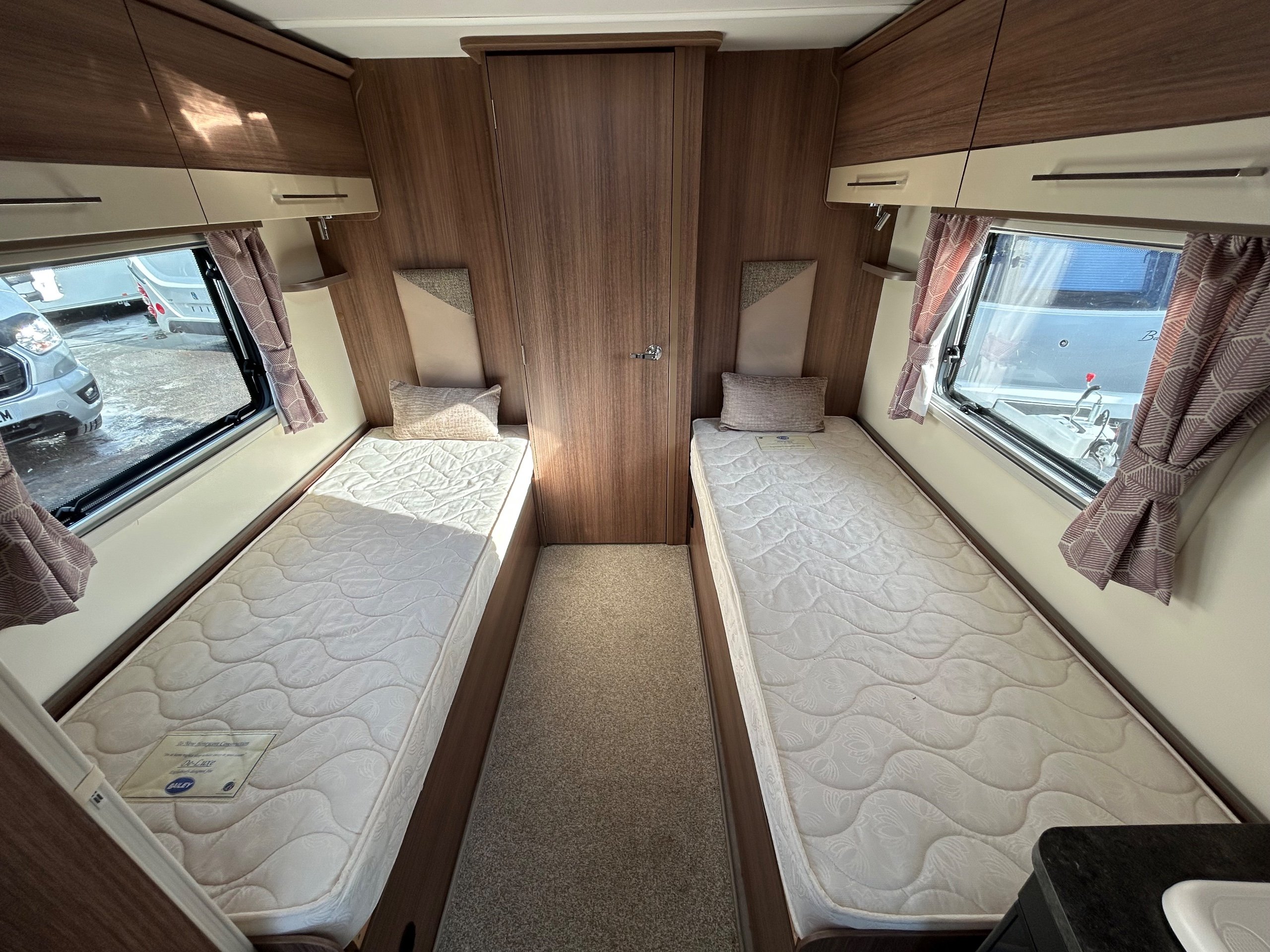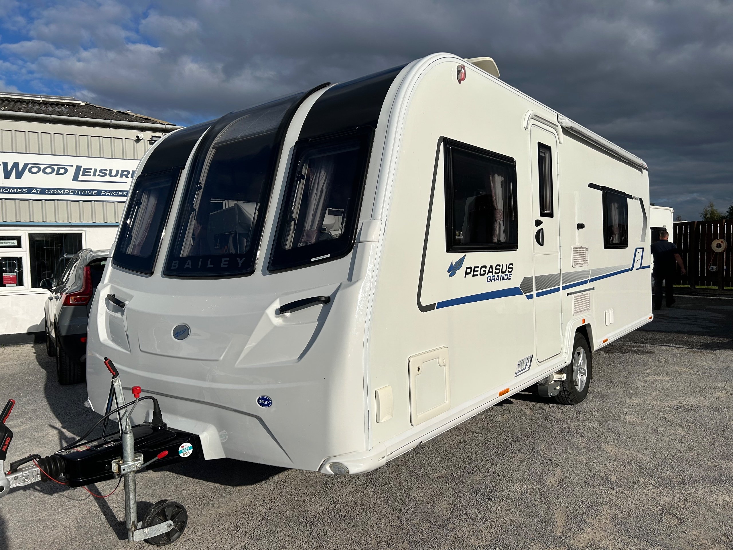 Full rear dressing room incorporating individual shower cubicle, toilet and vanity unit - fixed twin beds - central offside kitchen - lounge area / double bed at the front , a stunning luxurious 4-berth caravan that's perfect for family adventures and romantic getaways alike. With modern design and spacious interiors, this sleek vehicle offers a comfortable and stylish living space. The Pegasus Grande Rimini boasts high-quality fixtures and fittings, a fully-equipped kitchen, and a cozy sleeping area that can accommodate up to 4 people. The large panoramic sunroof floods the interior with natural light, creating a bright and airy atmosphere. With plenty of storage space and top-of-the-line amenities, this caravan is the ideal choice for those seeking a road trip filled with comfort and convenience. So why wait? Hit the road in style and luxury with the Bailey Pegasus Grande Rimini.