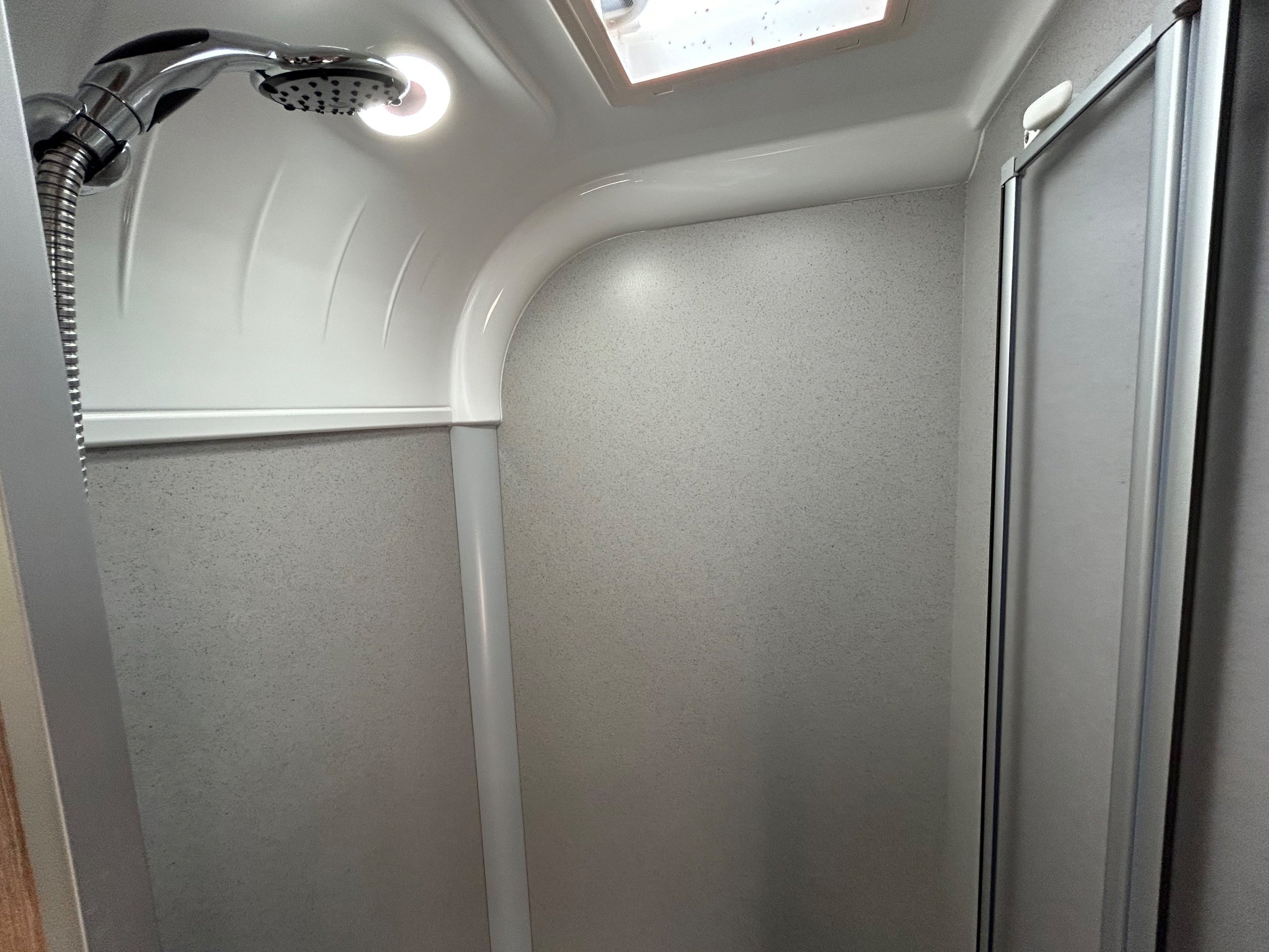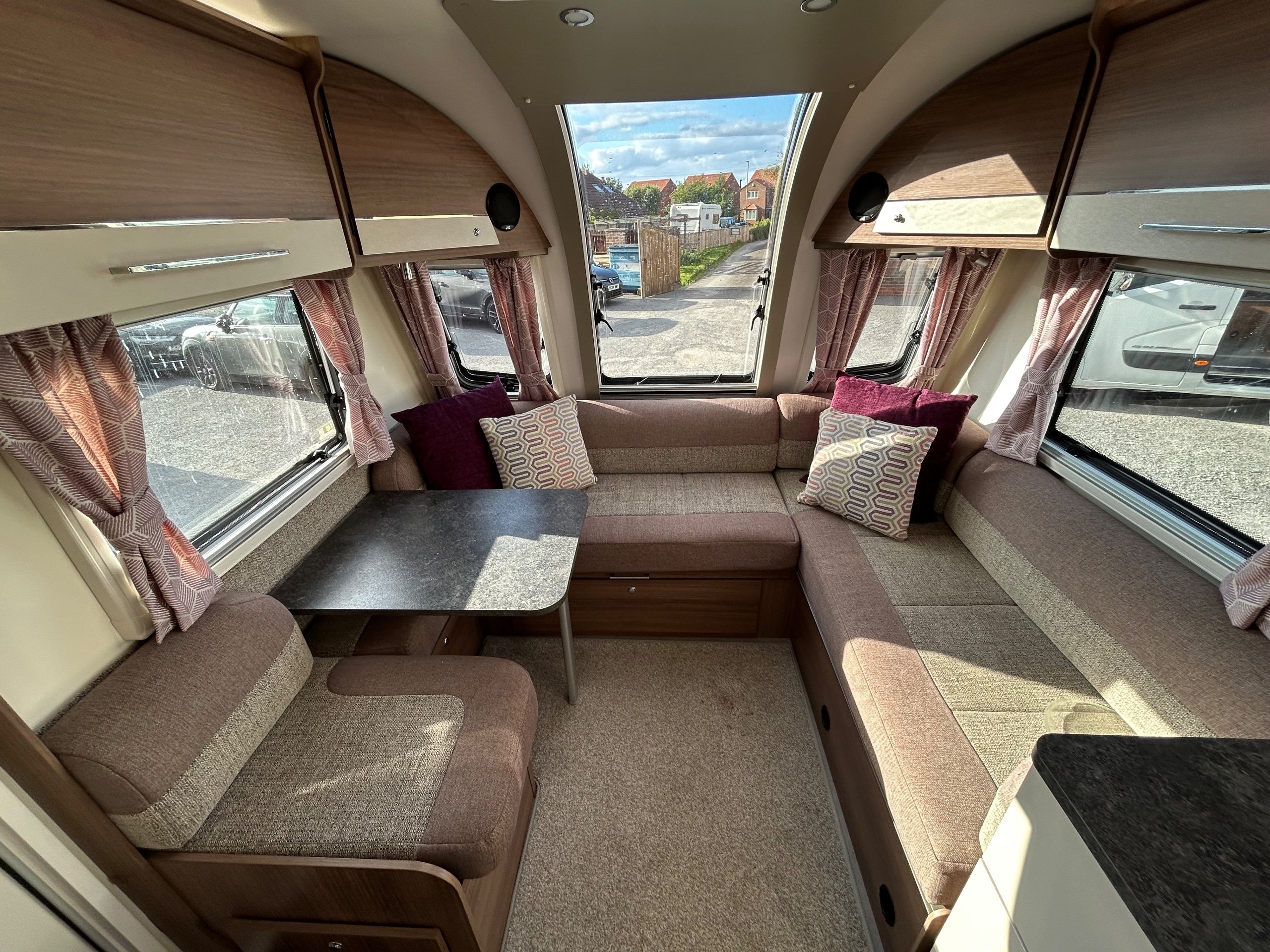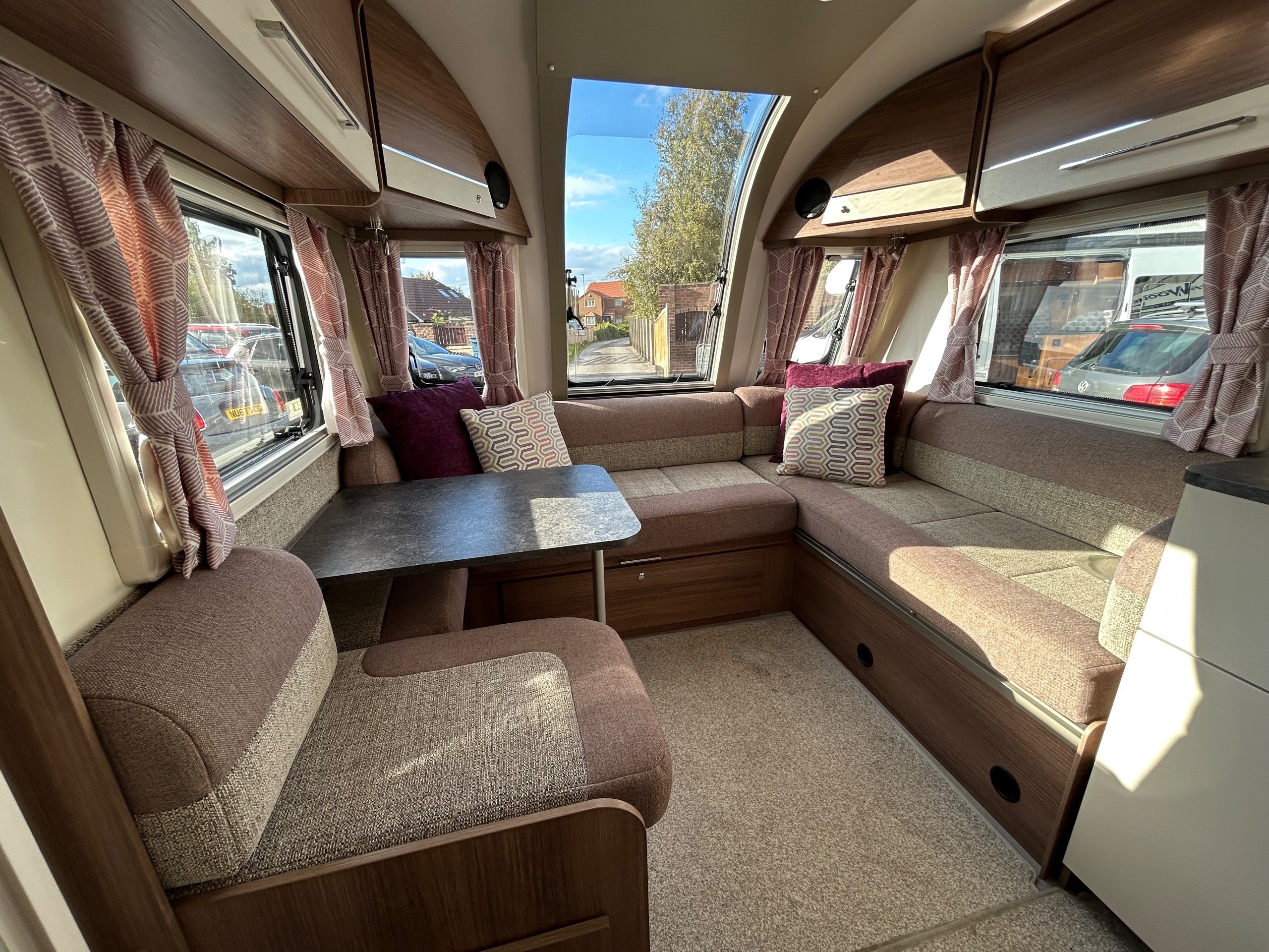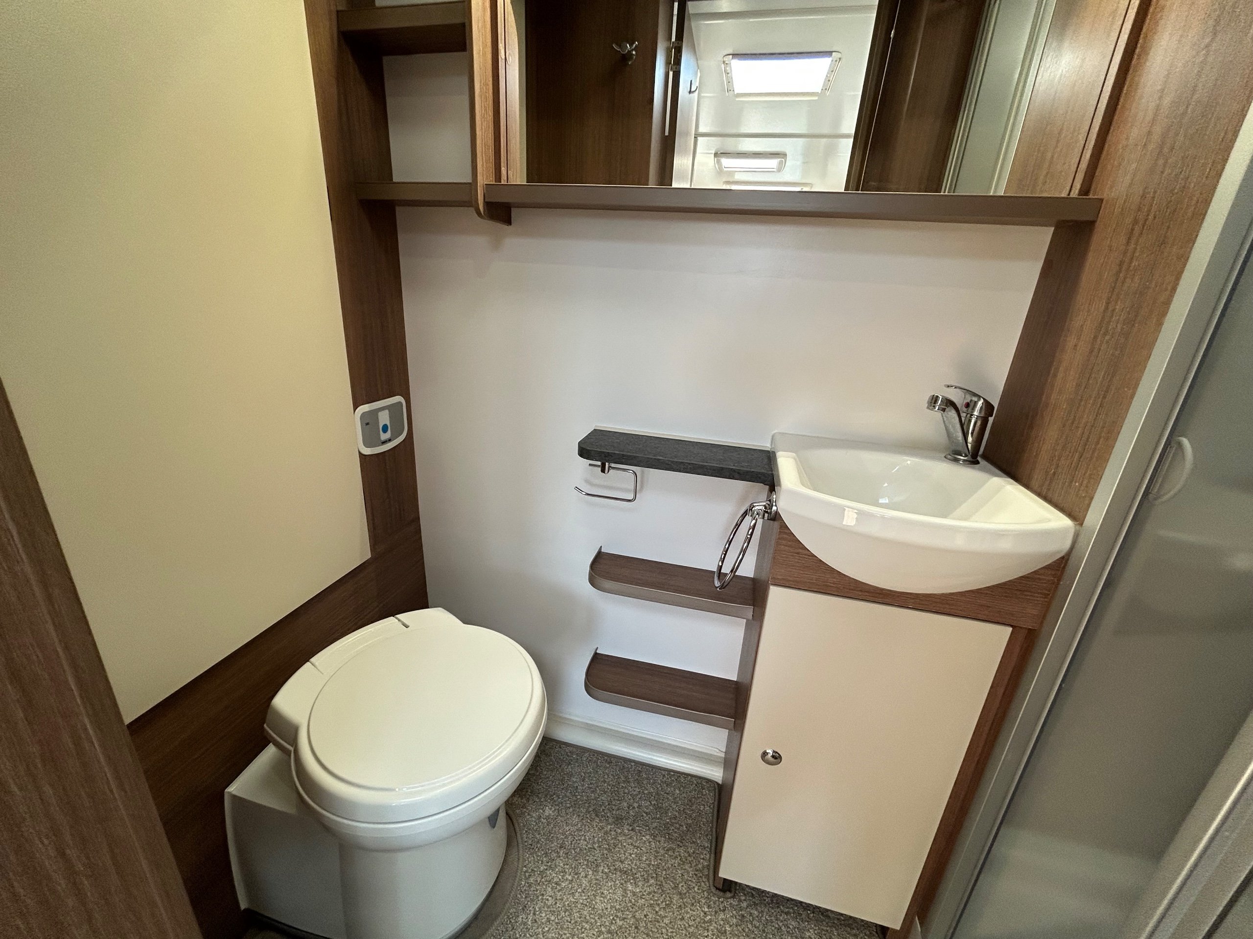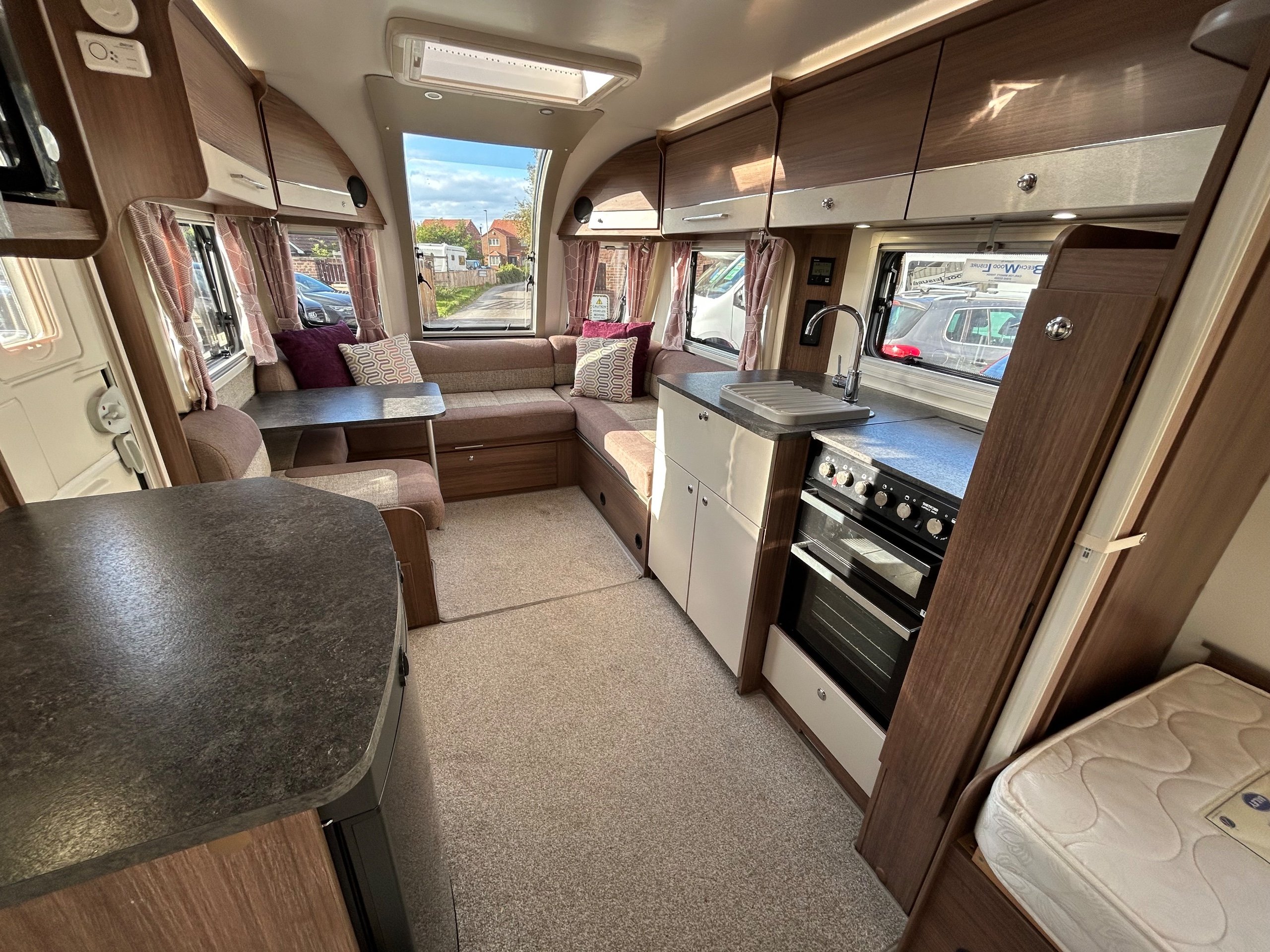 Full rear dressing room incorporating individual shower cubicle, toilet and vanity unit - fixed twin beds - central offside kitchen - lounge area / double bed at the front , a stunning luxurious 4-berth caravan that's perfect for family adventures and romantic getaways alike. With modern design and spacious interiors, this sleek vehicle offers a comfortable and stylish living space. The Pegasus Grande Rimini boasts high-quality fixtures and fittings, a fully-equipped kitchen, and a cozy sleeping area that can accommodate up to 4 people. The large panoramic sunroof floods the interior with natural light, creating a bright and airy atmosphere. With plenty of storage space and top-of-the-line amenities, this caravan is the ideal choice for those seeking a road trip filled with comfort and convenience. So why wait? Hit the road in style and luxury with the Bailey Pegasus Grande Rimini.