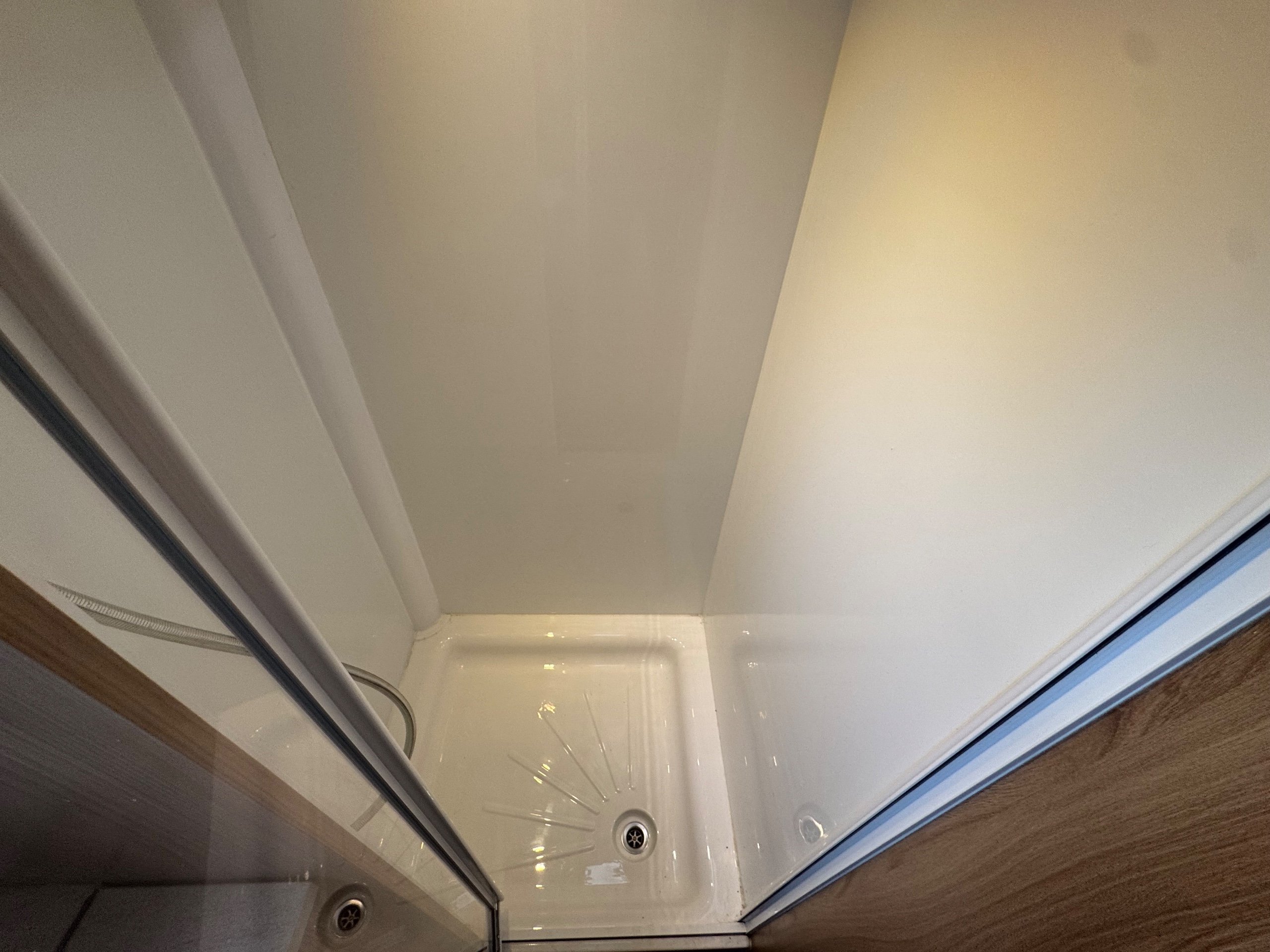 Complete end dressing room including a separate shower enclosure, vanity unit, heated towel rail toilet - nearside fixed double bed with double wardrobe opposite - central nearside dresser - central offside kitchen - 2 x singles / double bed at the front