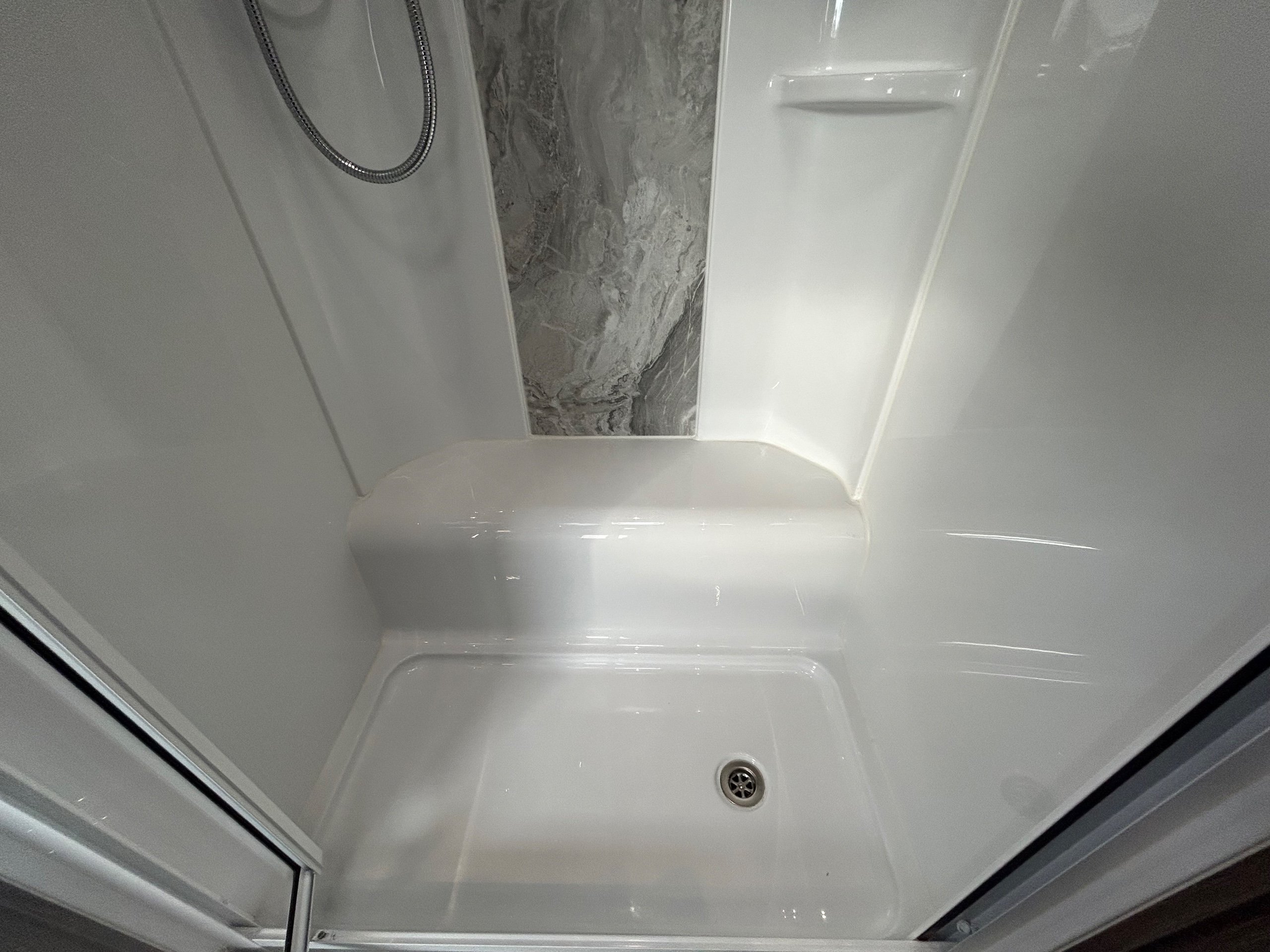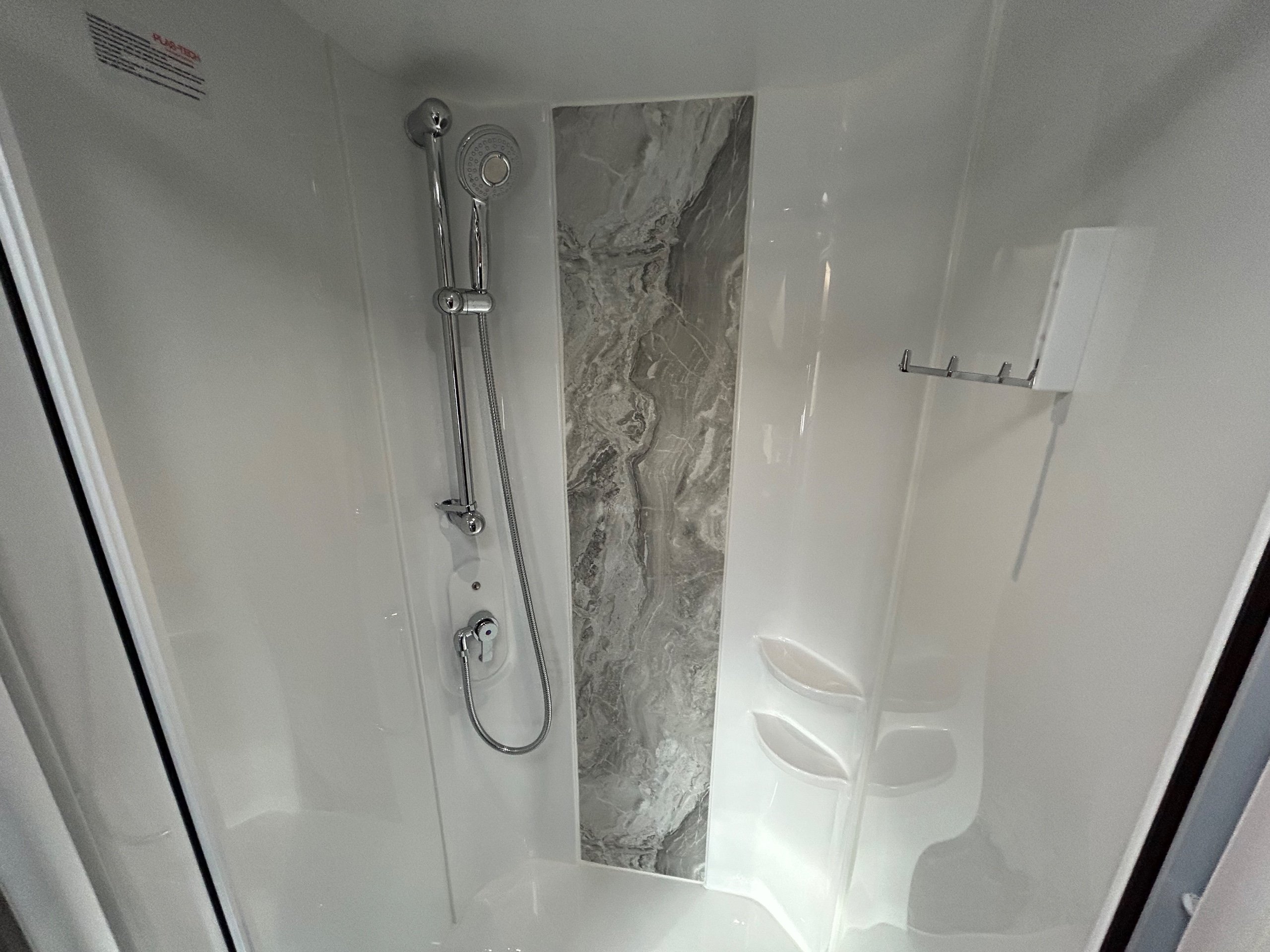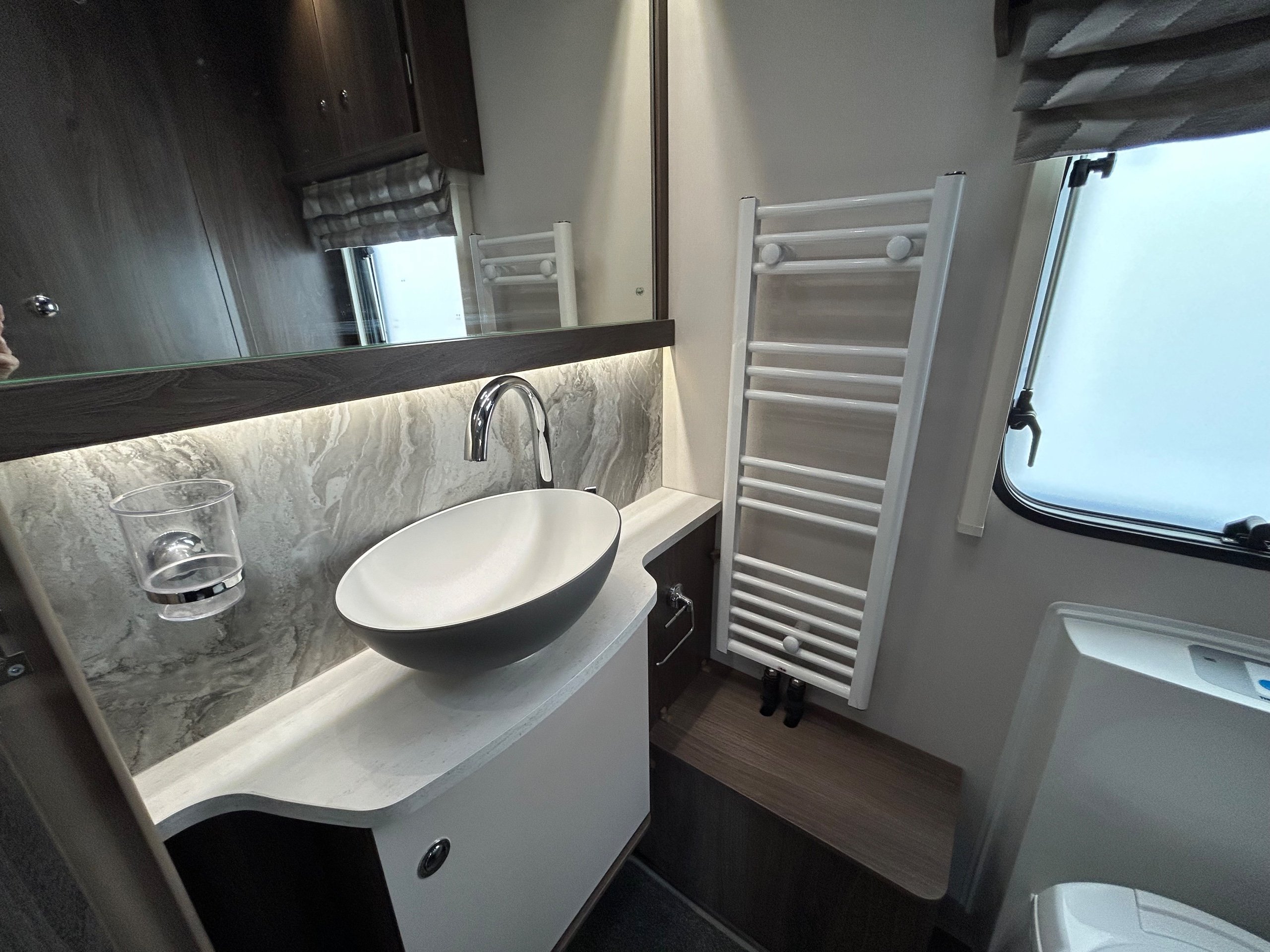central en suite dressing room featuring a vanity unit with a worktop in ' Shiky ' design with dual coloured vanity bowl - a large individual shower cubicle and a toilet - central offside kitchen boasting masses of storage room - L shape front seating.