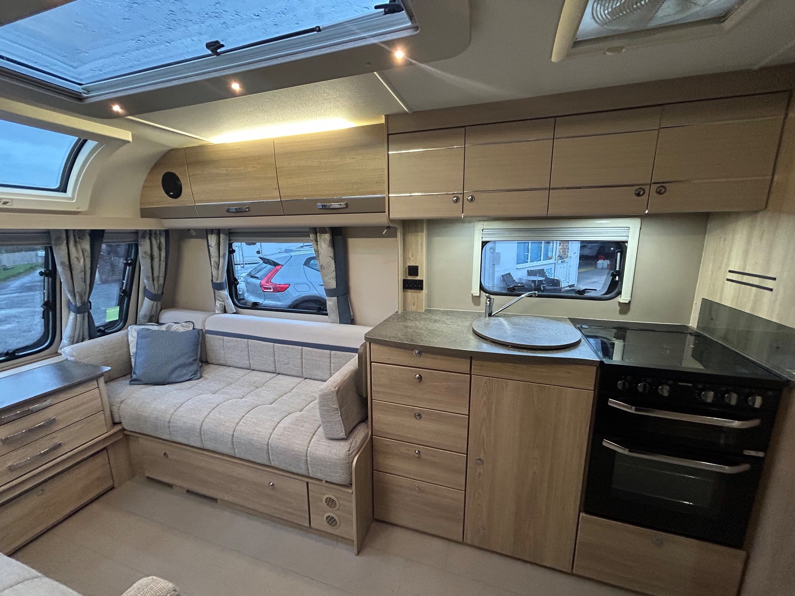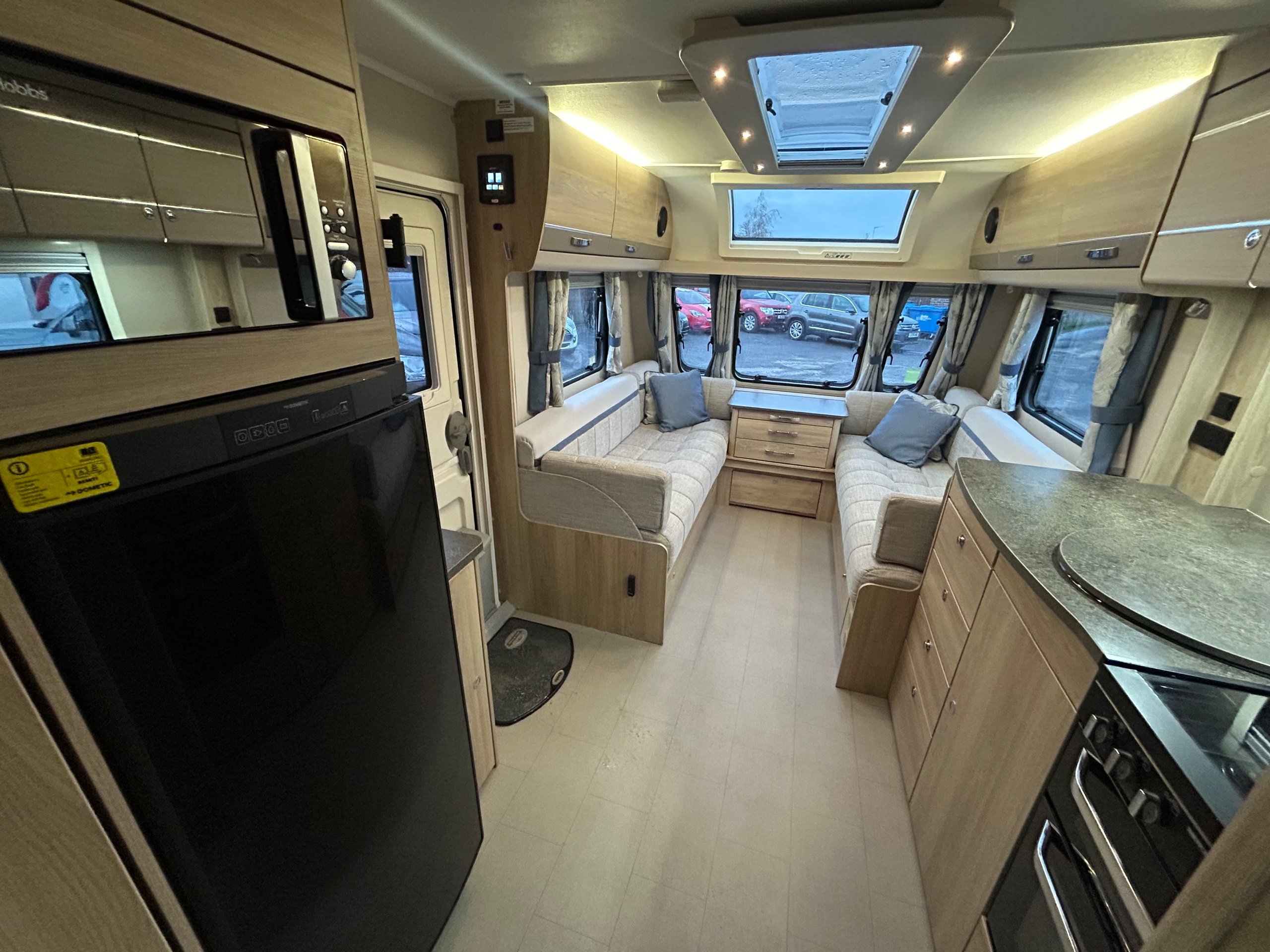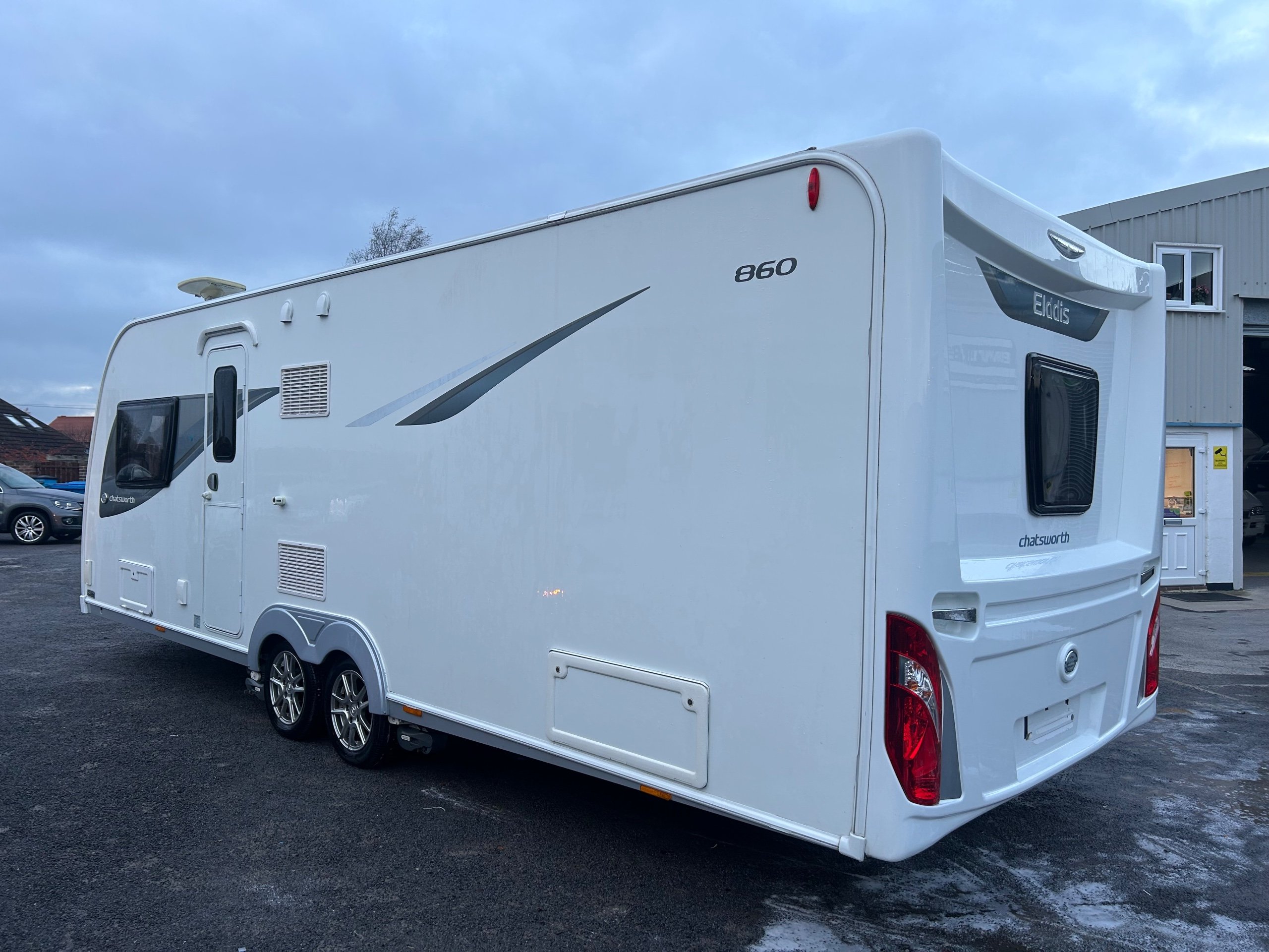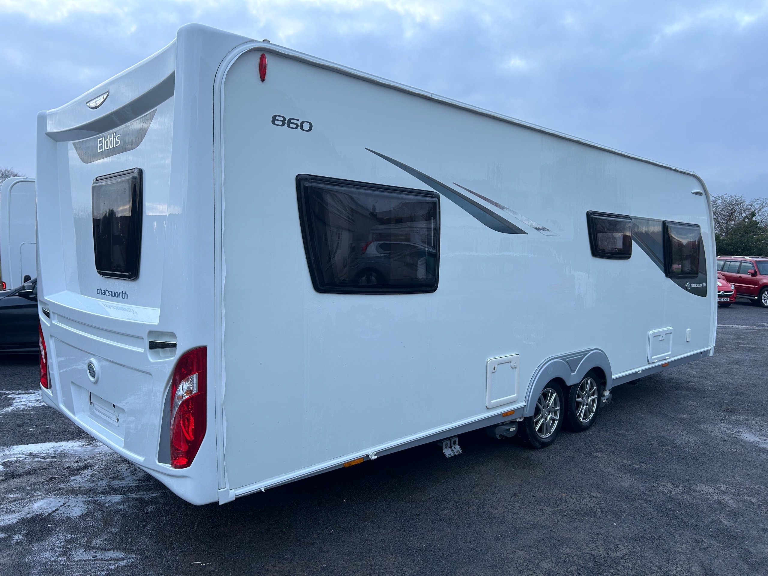 2019 ELDDIS CHATSWORTH 860 / 4 BERTH , - Full rear bedroom with nearside transverse island bed with adjoining wardrobes - central dressing room featuring and individual shower cubicle, toilet and vanity unit - central offside kitchen incorporating a larder fridge - 2 x singles / double bed / double dinette at the front ideal for a family or a small group of friends as it comfortably sleeps 4 people. This well-maintained caravan is spacious and practical, with a versatile layout that includes a fixed double bed and a front lounge area that easily converts into an additional double bed. The modern and functional kitchen is fully equipped with everything you need for cooking on the go, including a fridge, oven, grill, and gas hob. Ideal for those seeking a reliable and stylish caravan for their next adventure.