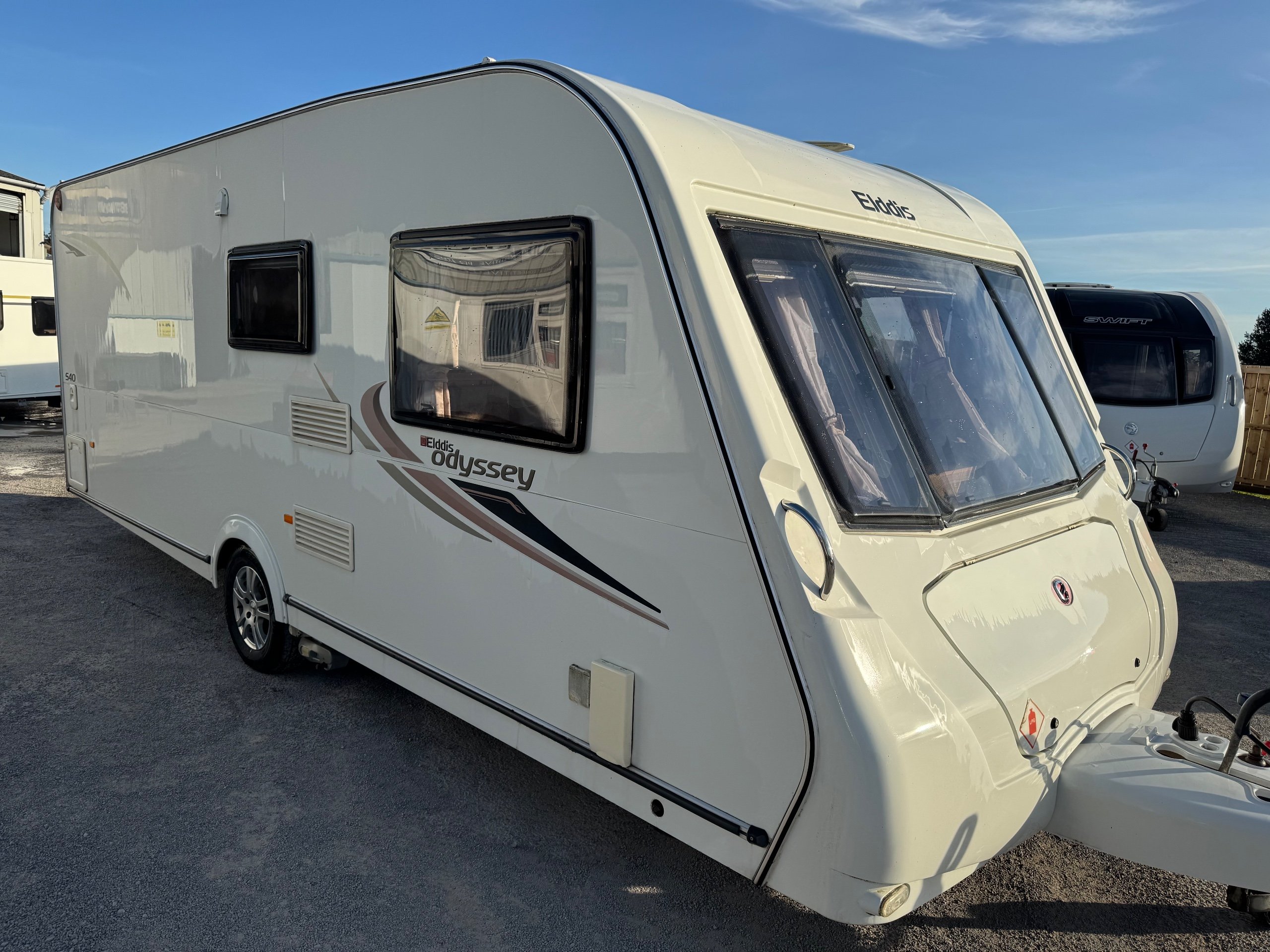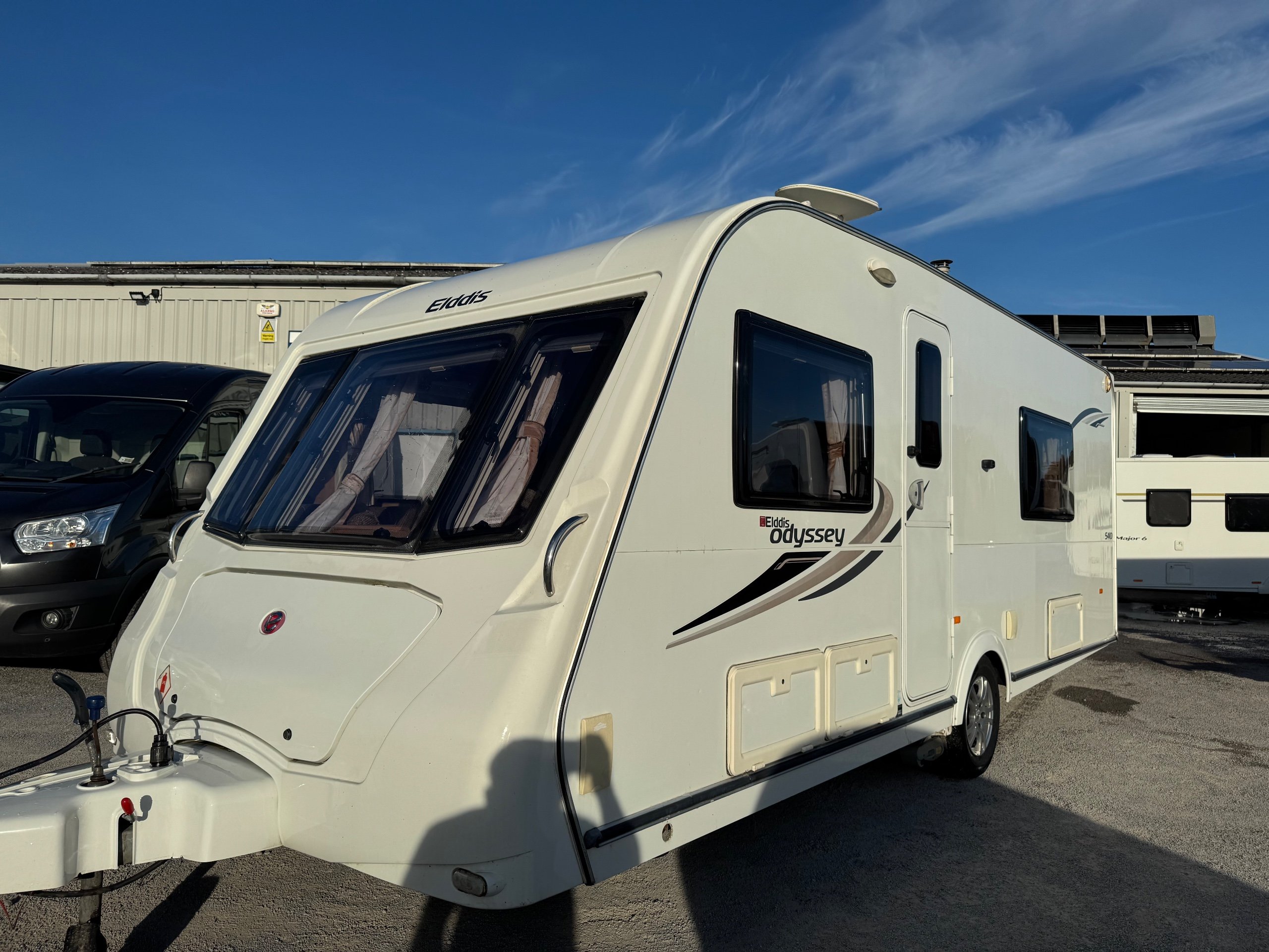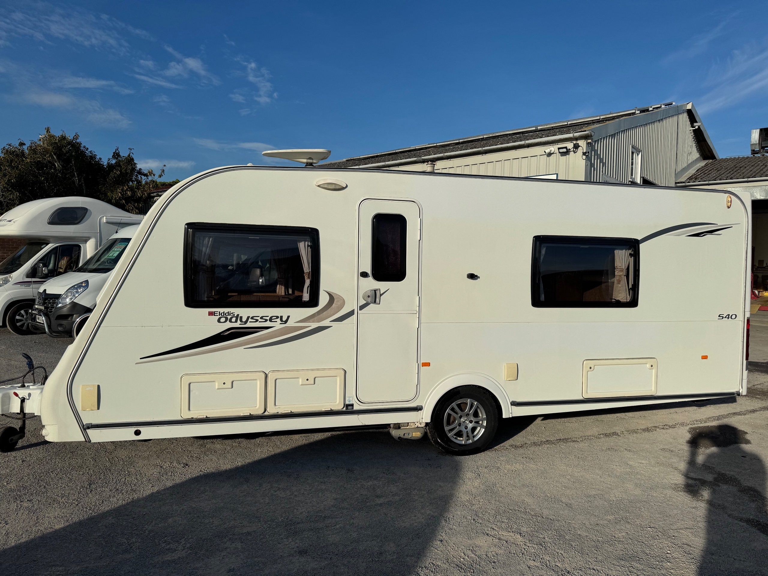 2011 ELDDIS ODYSSEY 540 / 4 berth - full rear dressing room incorporating a separate shower cubicle, toilet and vanity unit - nearside rear fixed double bed complete with adjacent wardrobe - offside central kitchen - nearside central dresser / TV display - 2 x single / 1 x double bed at the front - A very desirable modern tourer representing fantastic value for money ! Ample storage throughout the van providing a spacious and comfortable living space for the whole family to enjoy !