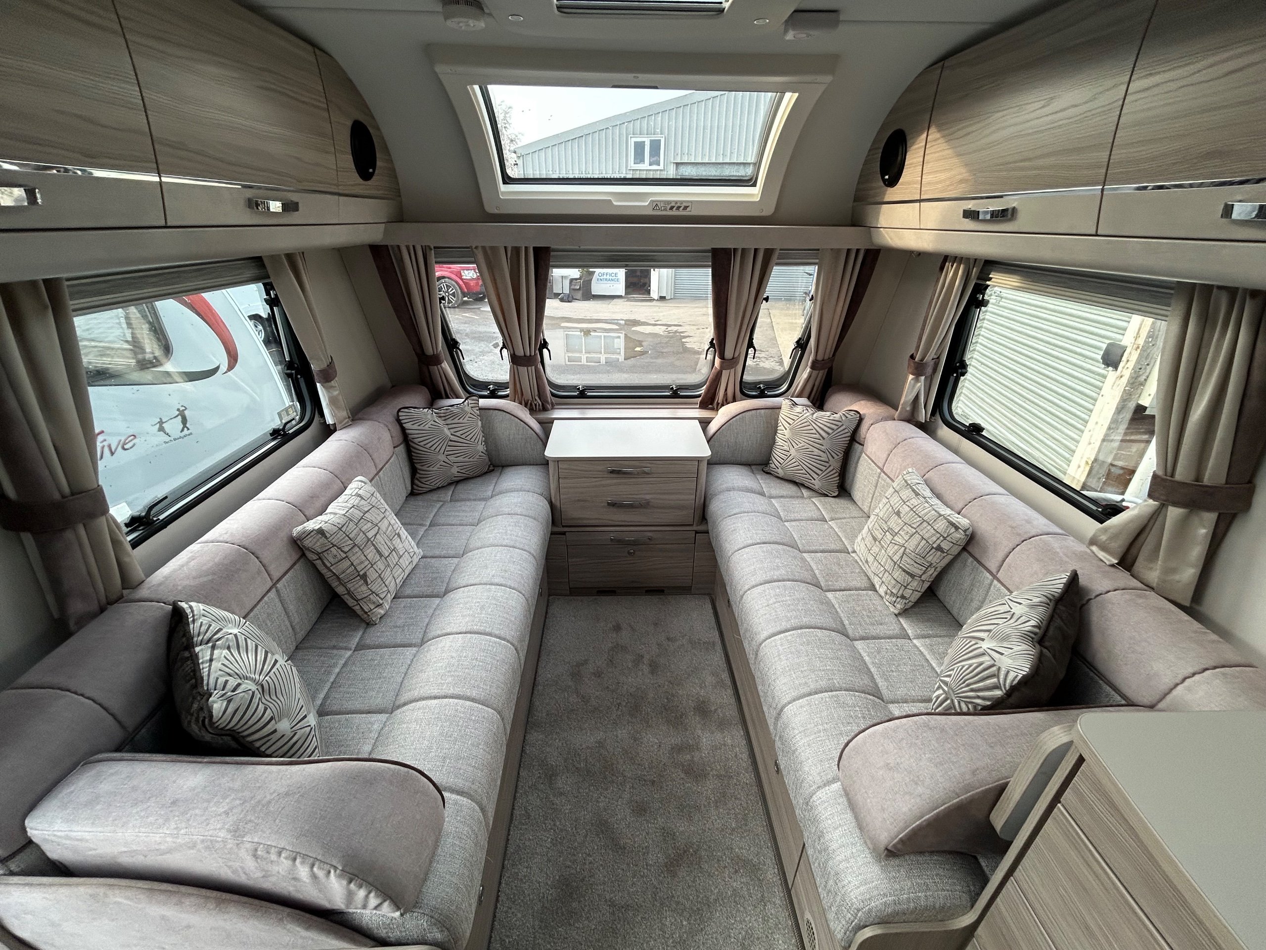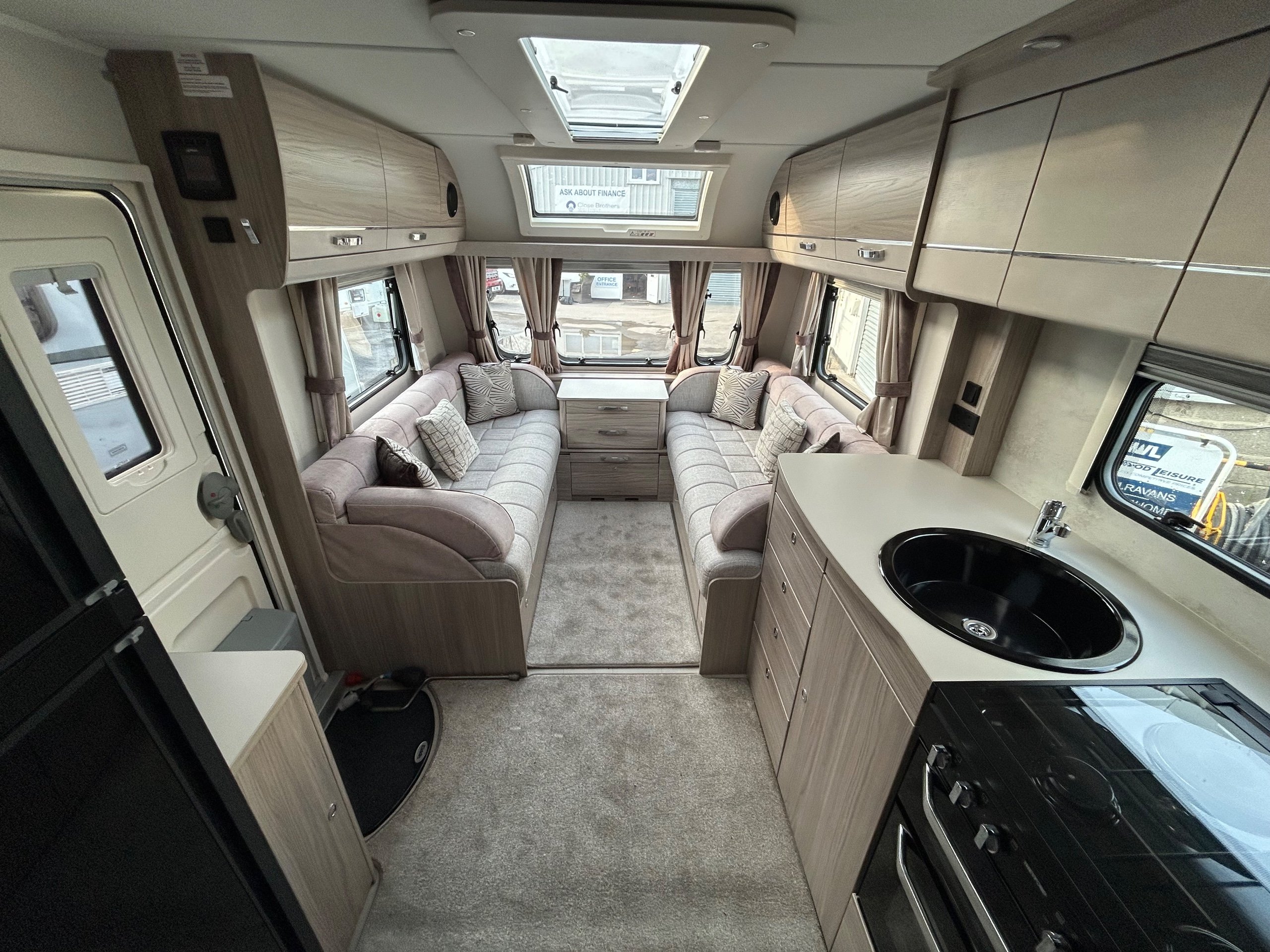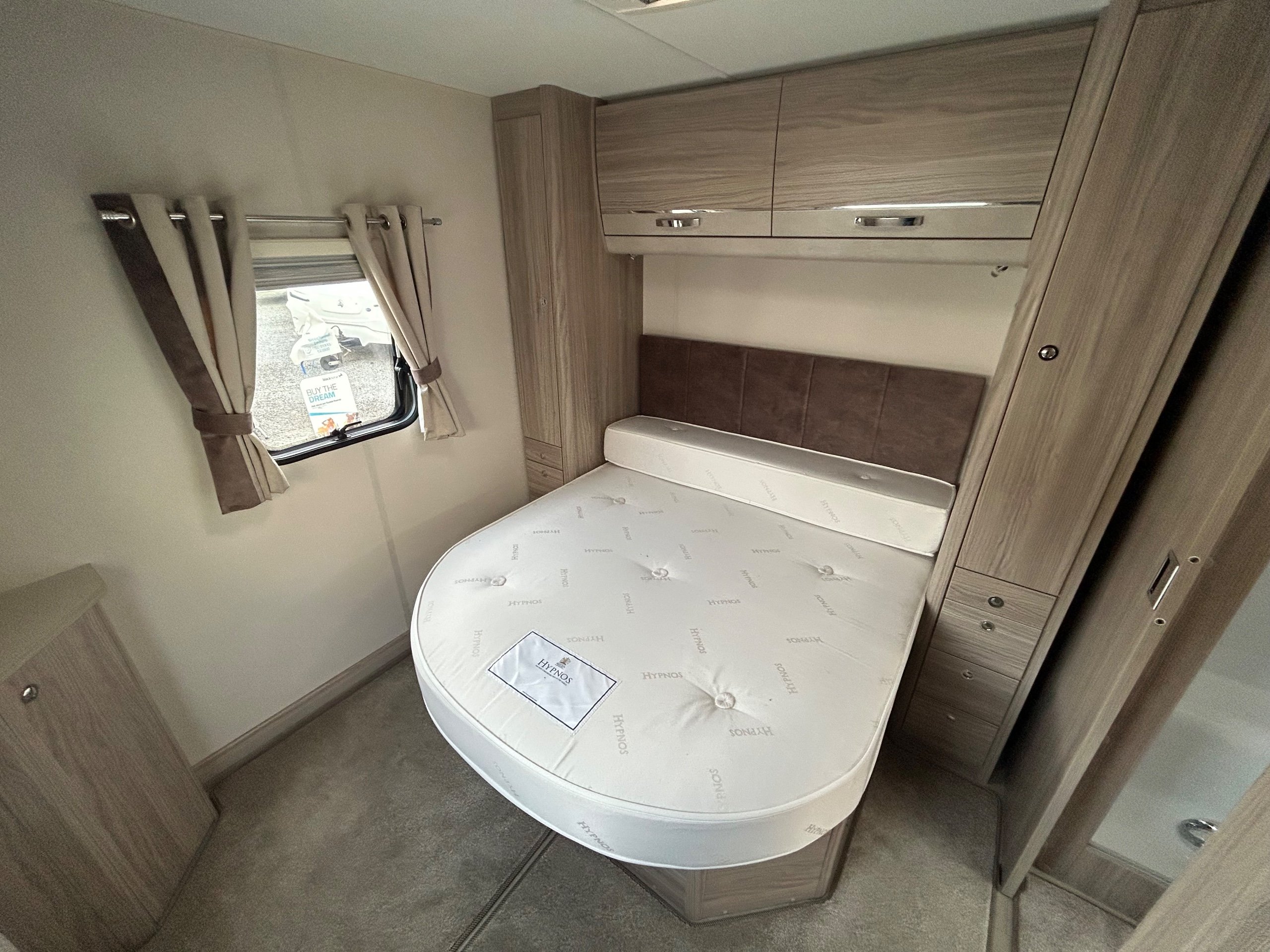 Full rear bedroom featuring a transverse island bed with adjoining wardrobes - central dressing room incorporating individual shower cubicle, toilet and vanity unit - central offside kitchen benefitting from a larder fridge - 2 x 6' singles / double / bed / dinette ate the front - without doubt this model has a 5 star apartment feel , a huge specification and contemporary soft furnishings - HARDLY EVER USED AND IN IMMACULATE CONDITION THROUGHOUT !