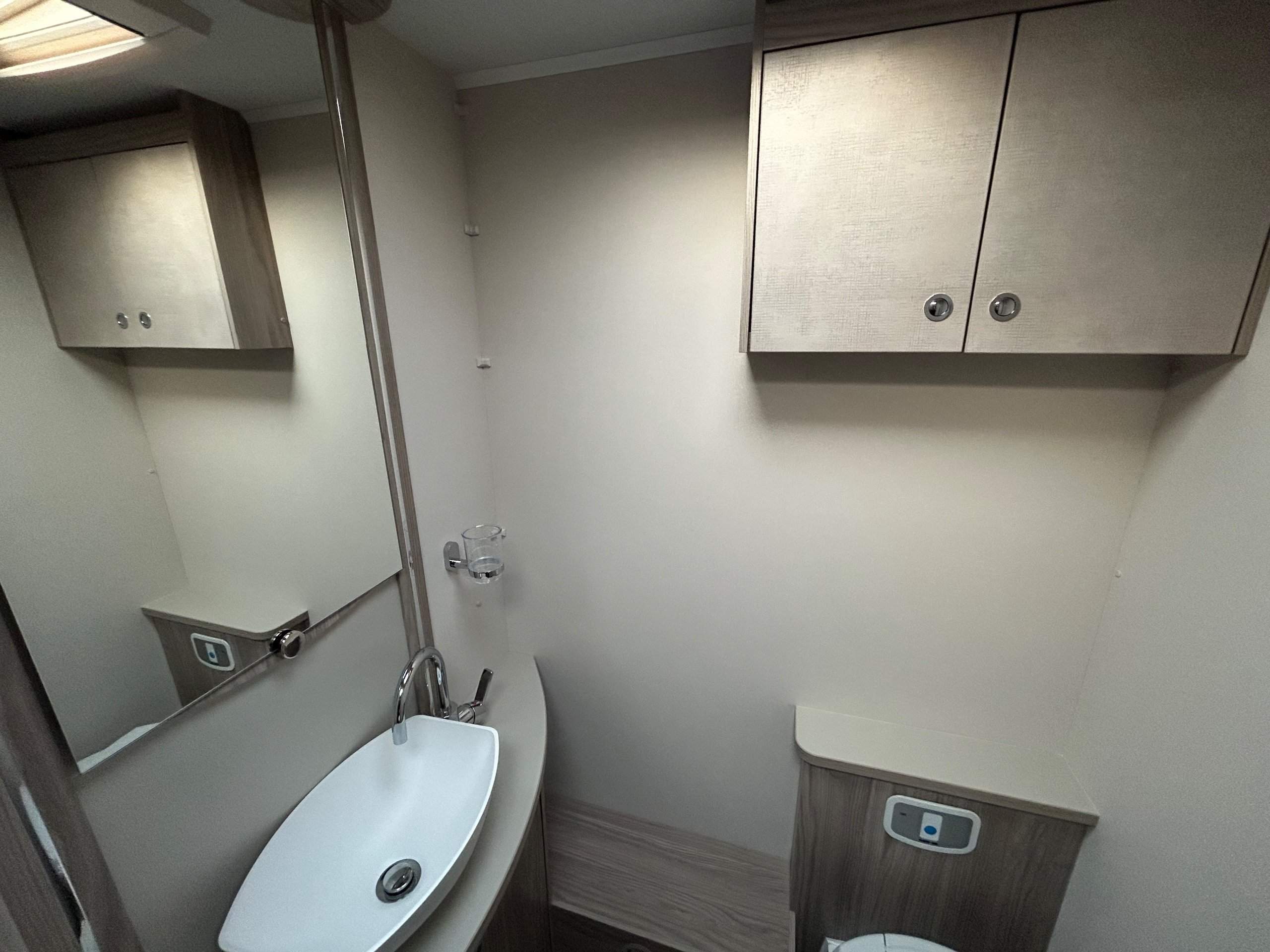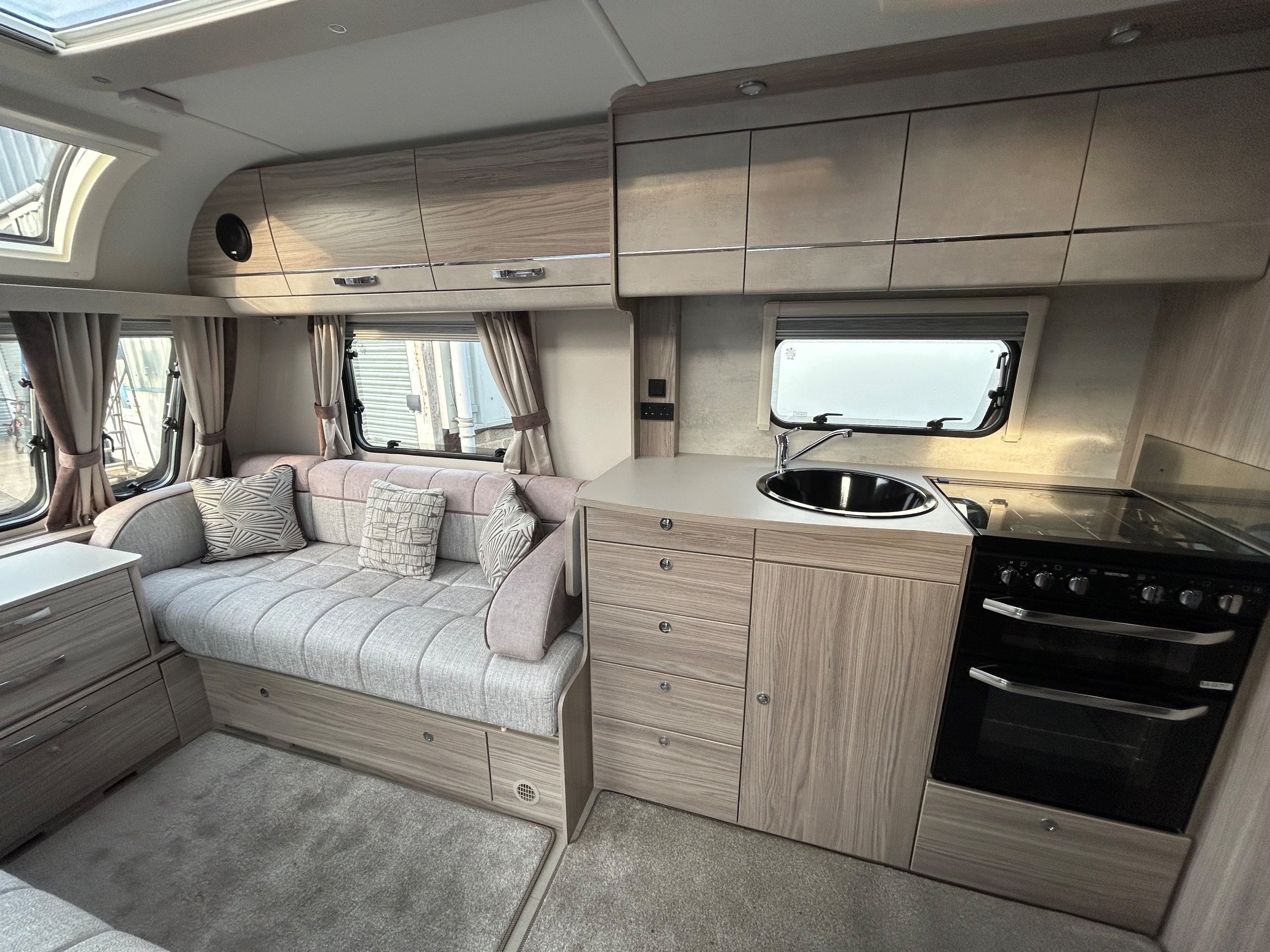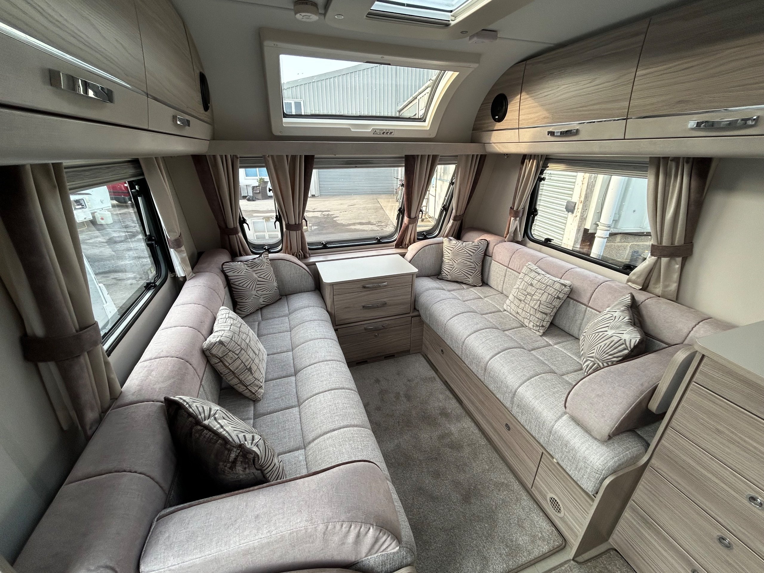 Full rear bedroom featuring a transverse island bed with adjoining wardrobes - central dressing room incorporating individual shower cubicle, toilet and vanity unit - central offside kitchen benefitting from a larder fridge - 2 x 6' singles / double / bed / dinette ate the front - without doubt this model has a 5 star apartment feel , a huge specification and contemporary soft furnishings - HARDLY EVER USED AND IN IMMACULATE CONDITION THROUGHOUT !