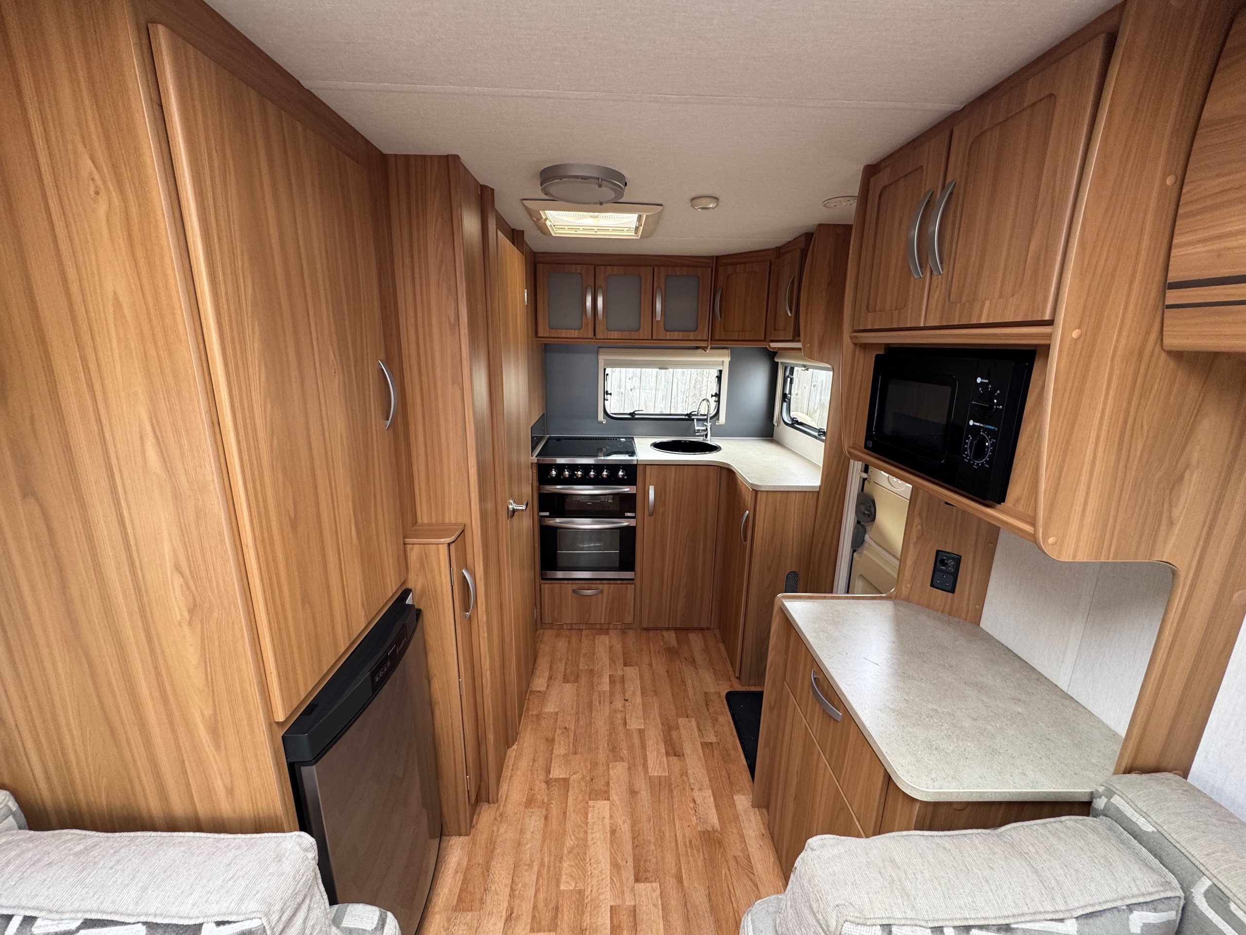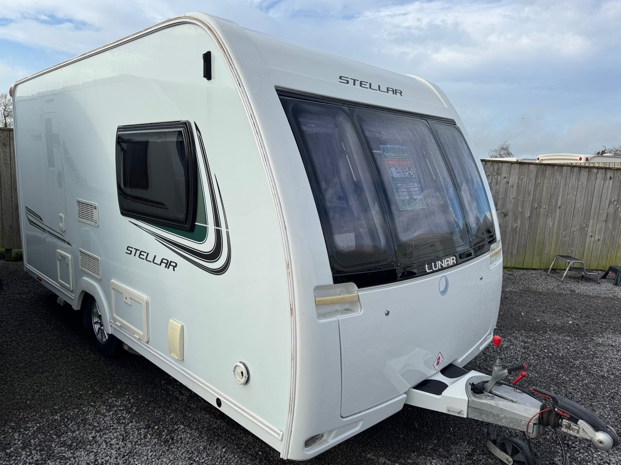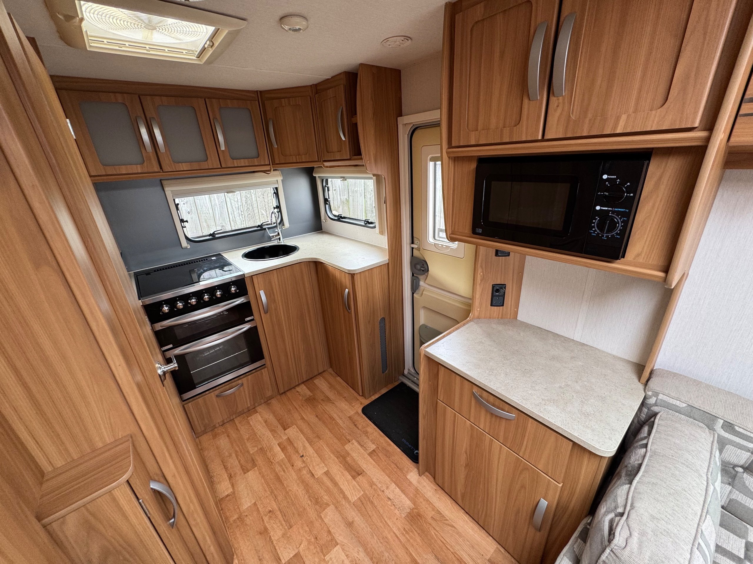 201 LUNAR STELLAR / 2 BERTH - end kitchen - rear offside corner dressing room including separate shower cubicle, vanity unit and toilet - central offside double wardrobe - central nearside kitchen - 2 x singles / double at the front - a lovely example of this cute, comfy and cosy tourer - in great condition throughout and benefitting from a very unique layout - extremely lightweight !