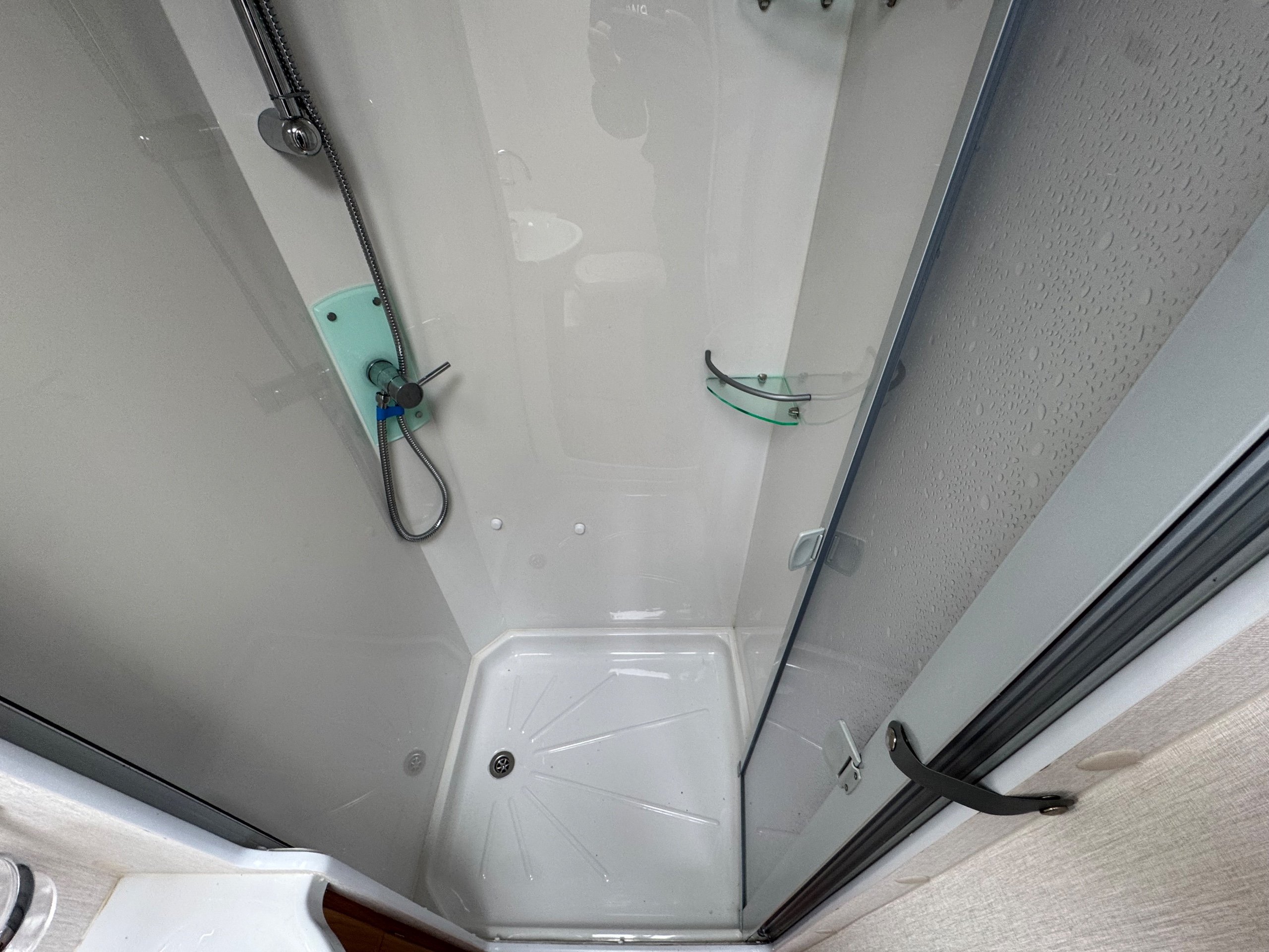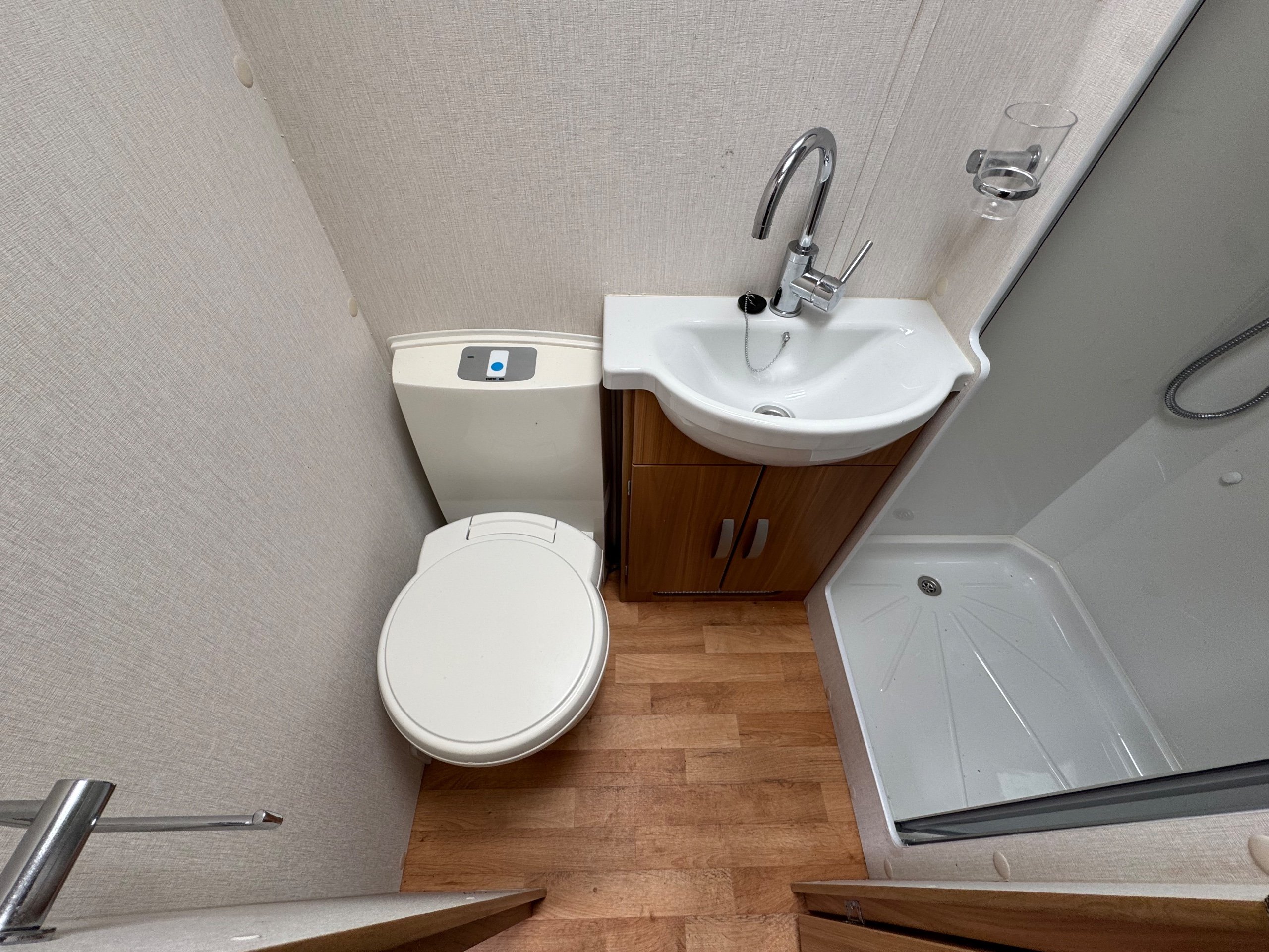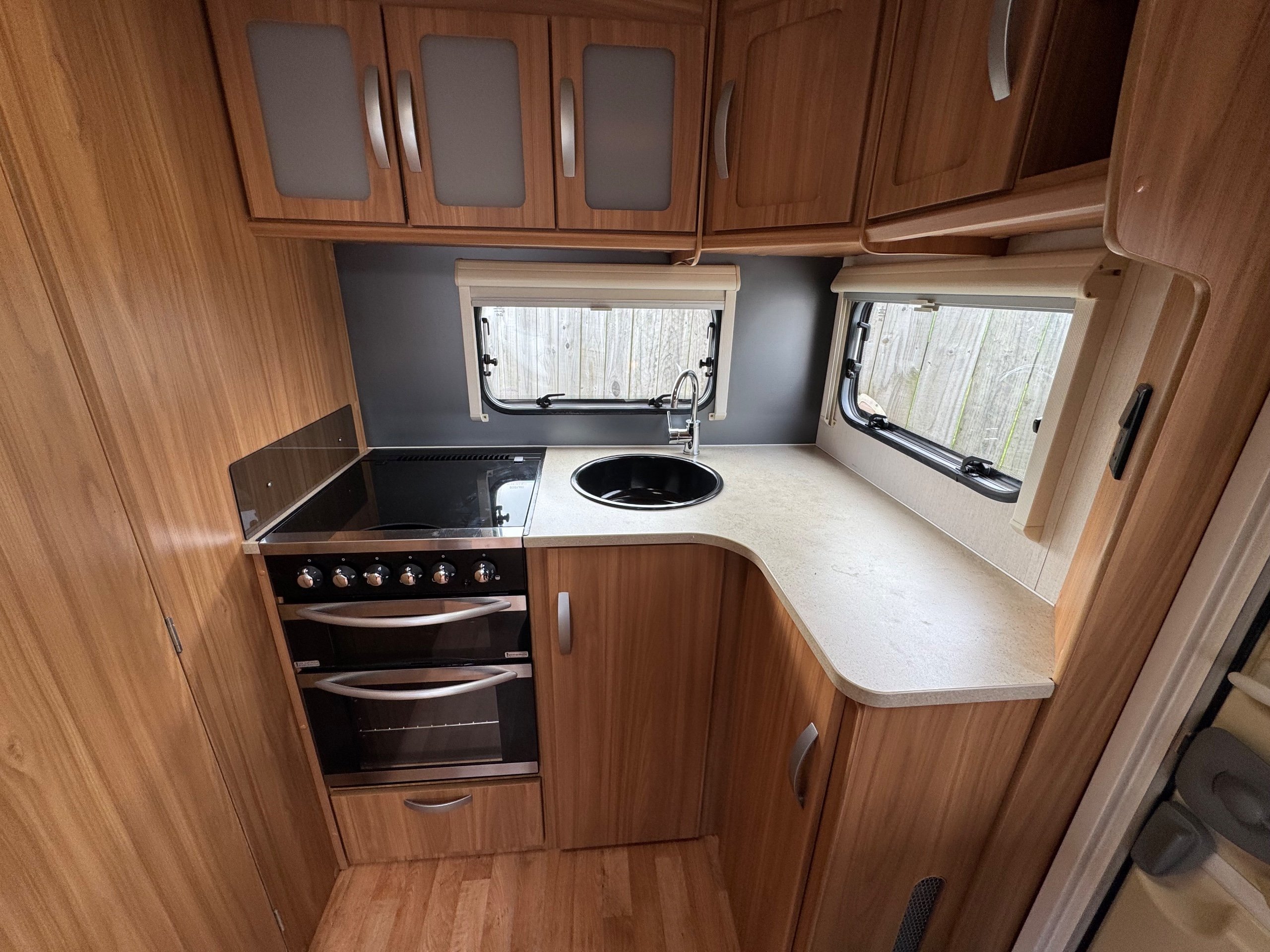 201 LUNAR STELLAR / 2 BERTH - end kitchen - rear offside corner dressing room including separate shower cubicle, vanity unit and toilet - central offside double wardrobe - central nearside kitchen - 2 x singles / double at the front - a lovely example of this cute, comfy and cosy tourer - in great condition throughout and benefitting from a very unique layout - extremely lightweight !