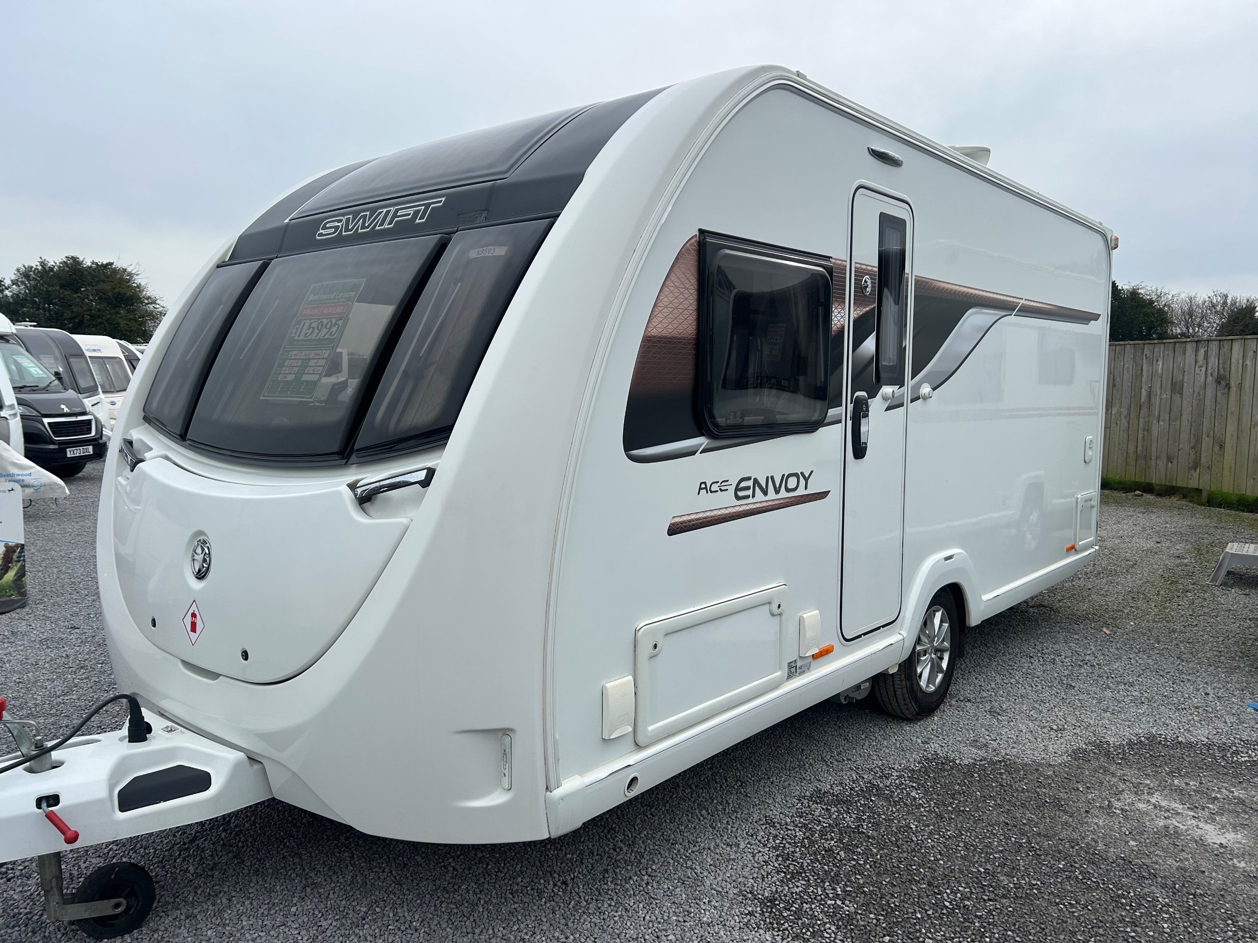 Nearside rear corner washroom incorporating a swivel toilet and divided shower area - nearside vanity unit - offside rear fixed double bed complete with adjoining wardrobes - nearside central kitchen - offside central wardrobe - 2 x singles / 1 x large double at the front - chrome grab handles - 100 Watt solar panel fitted - Alarm system - external gas BBQ point - external 240V mains socket fitted - We are extremely proud to offer for sale this 2019 model tourer, this model is in amazing condition throughout - lightweight in comparison to its competitors!