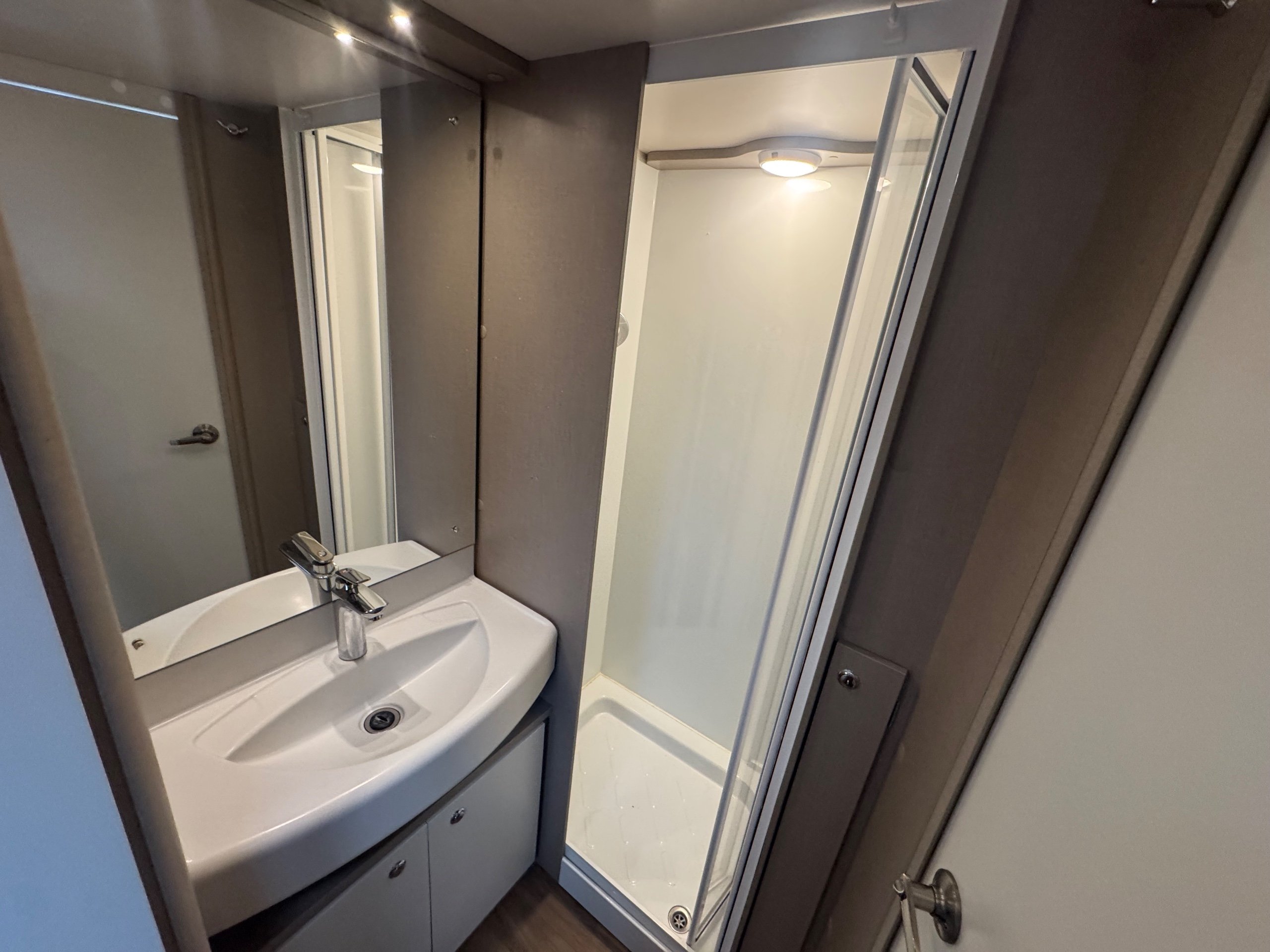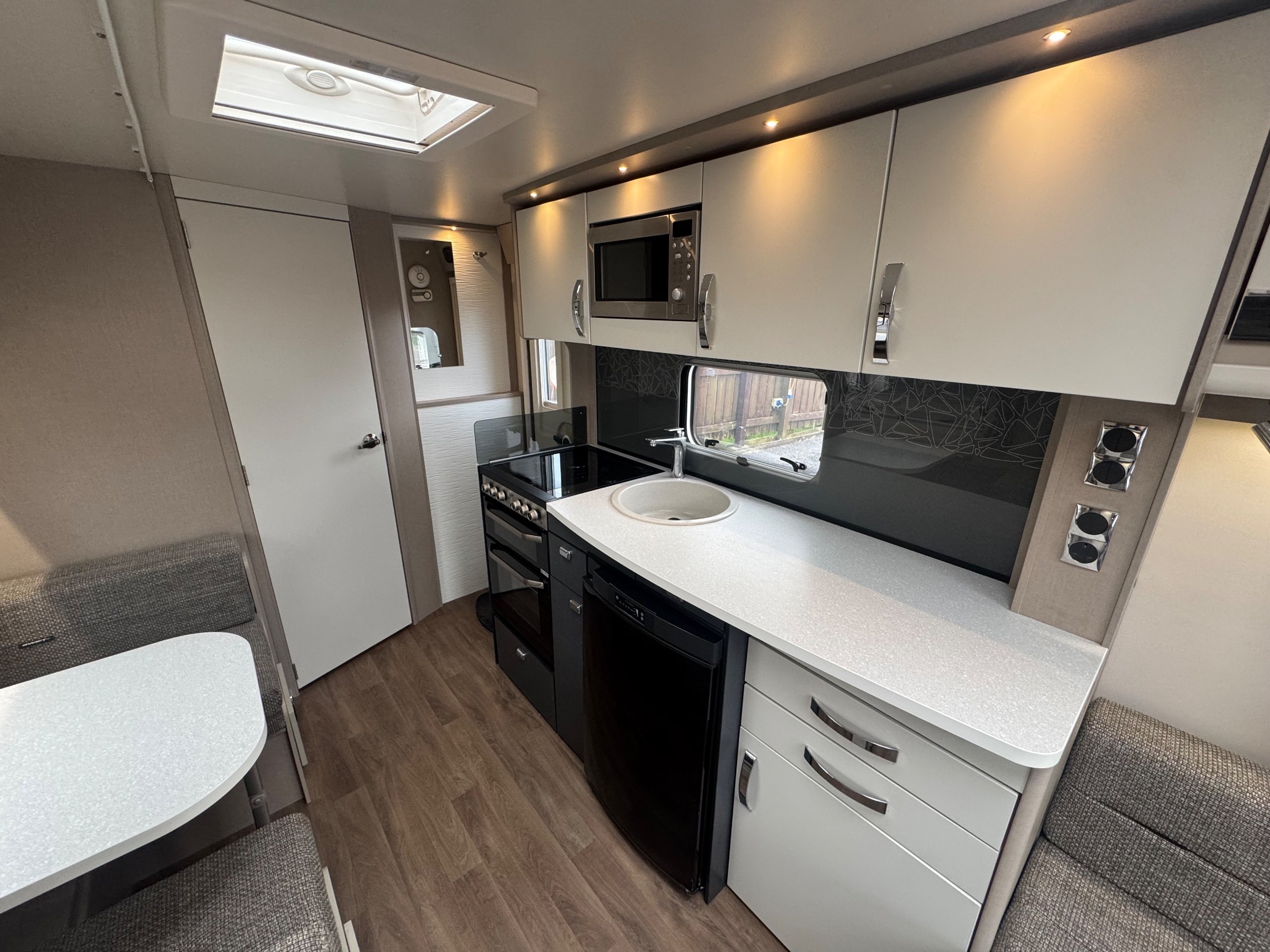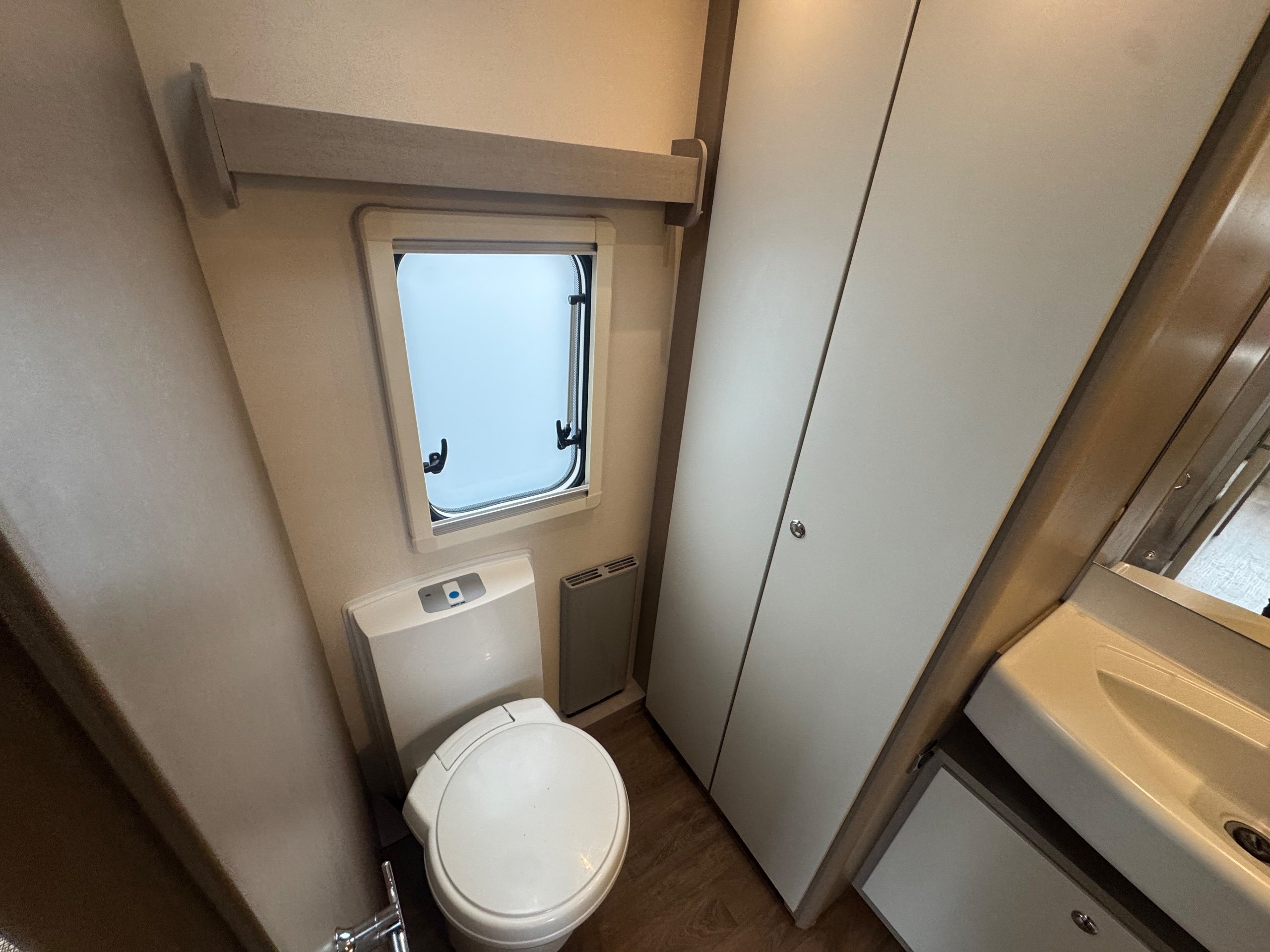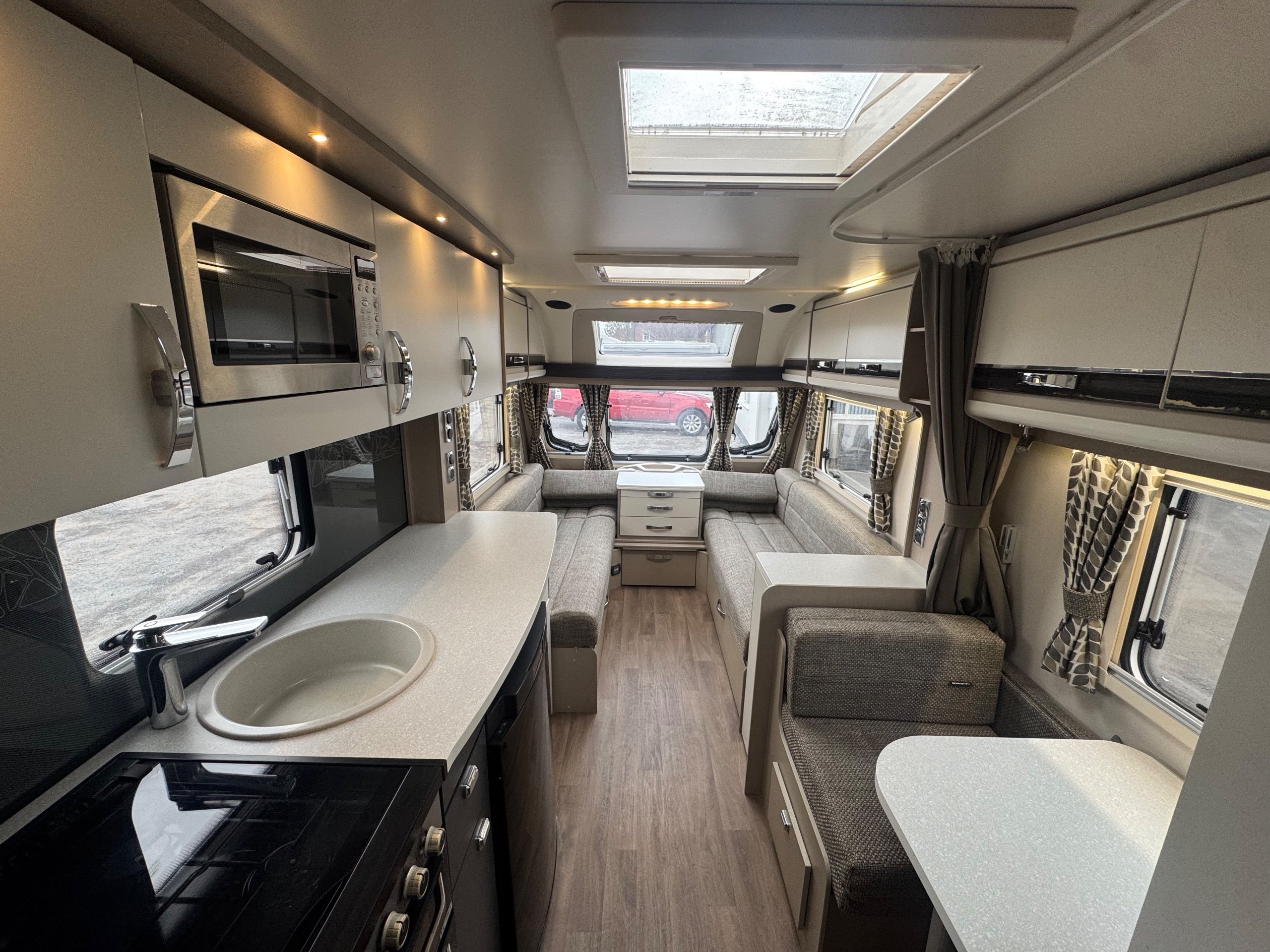 Complete end dressing room including separate shower enclosure, illuminated vanity unit, double wardrobe, radiator and toilet - central nearside kitchen - central offside dinette with retractable bunk - 2 x singles / double at the front - this tourer has clearly been cherished throughout it's short life as it is in brilliant condition both inside and out - benefitting from a very spacious feel and also offering top specification - including upgraded furnishings and ALDE central heating!