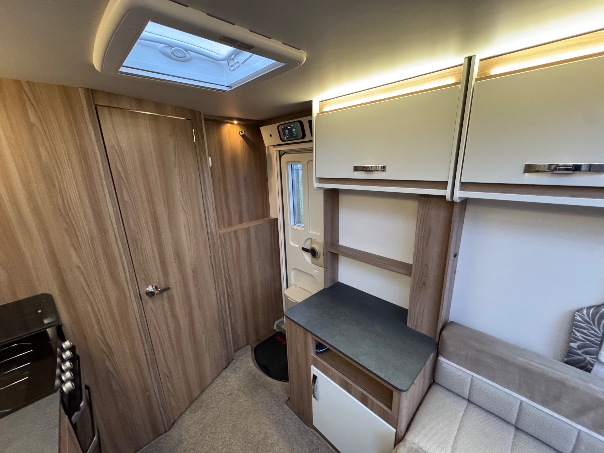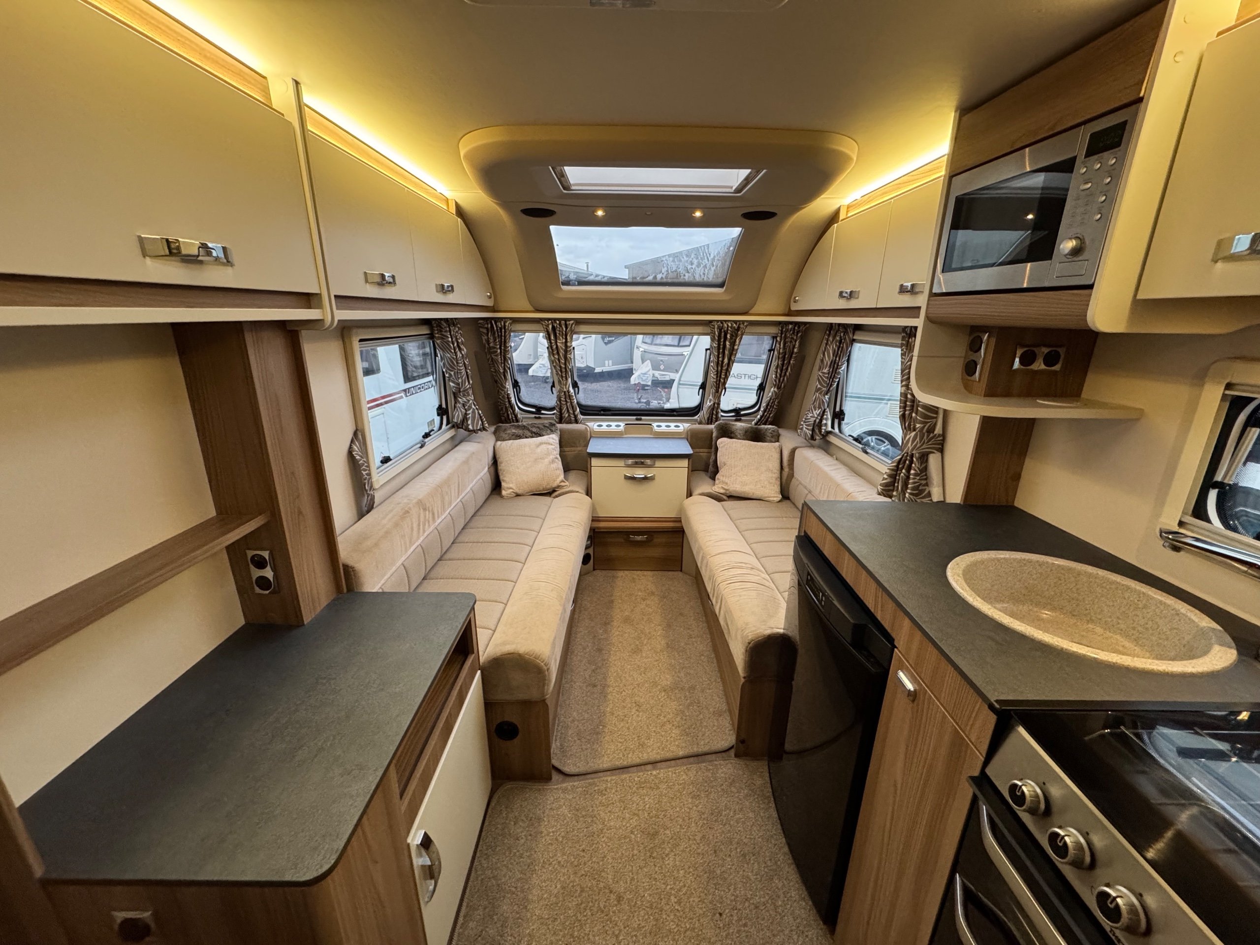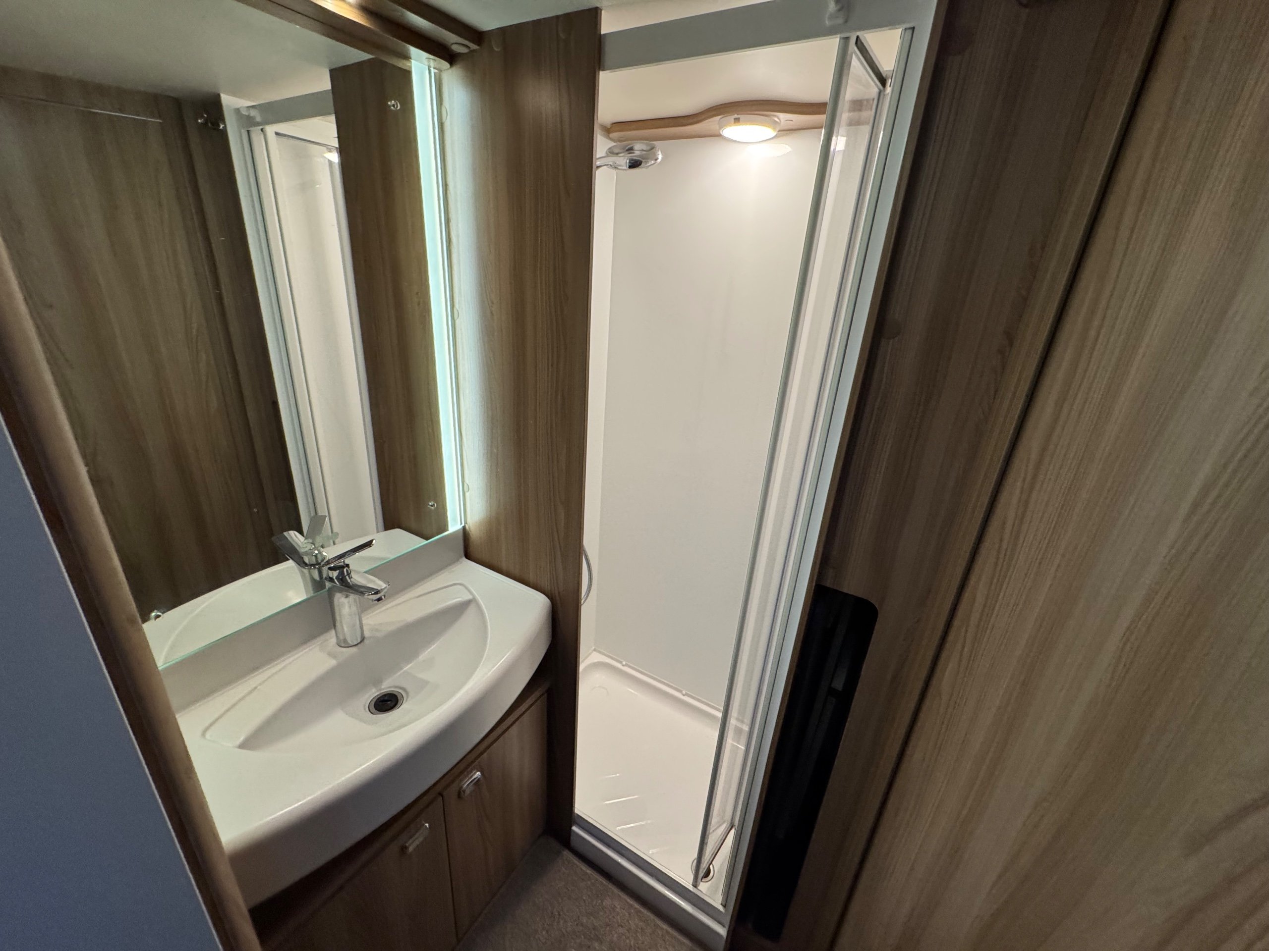 Complete end dressing room including separate shower enclosure, vanity unit, wardrobe and toilet - central nearside dresser - central offside kitchen - 2 x singles / double at the front - an amazing example of this cosy, cute and compact tourer - comparatively lightweight without compromising on specification - in as new condition both inside and out