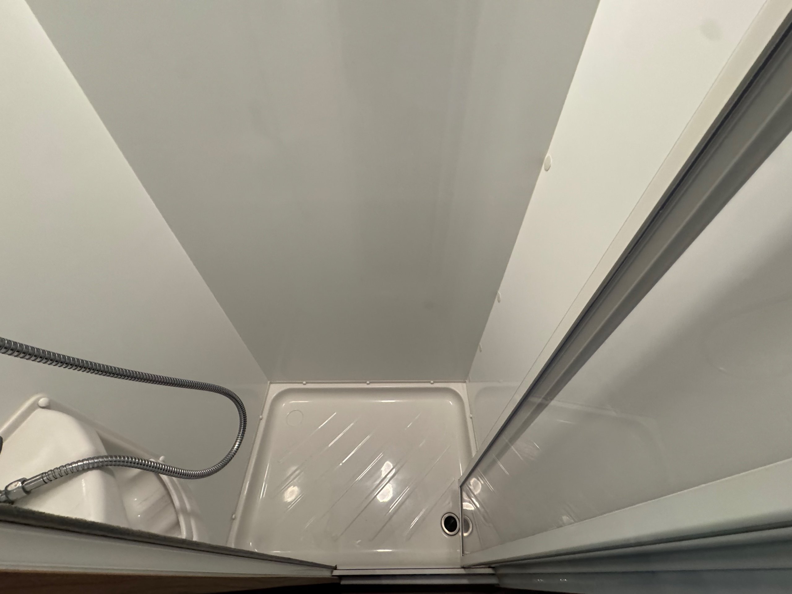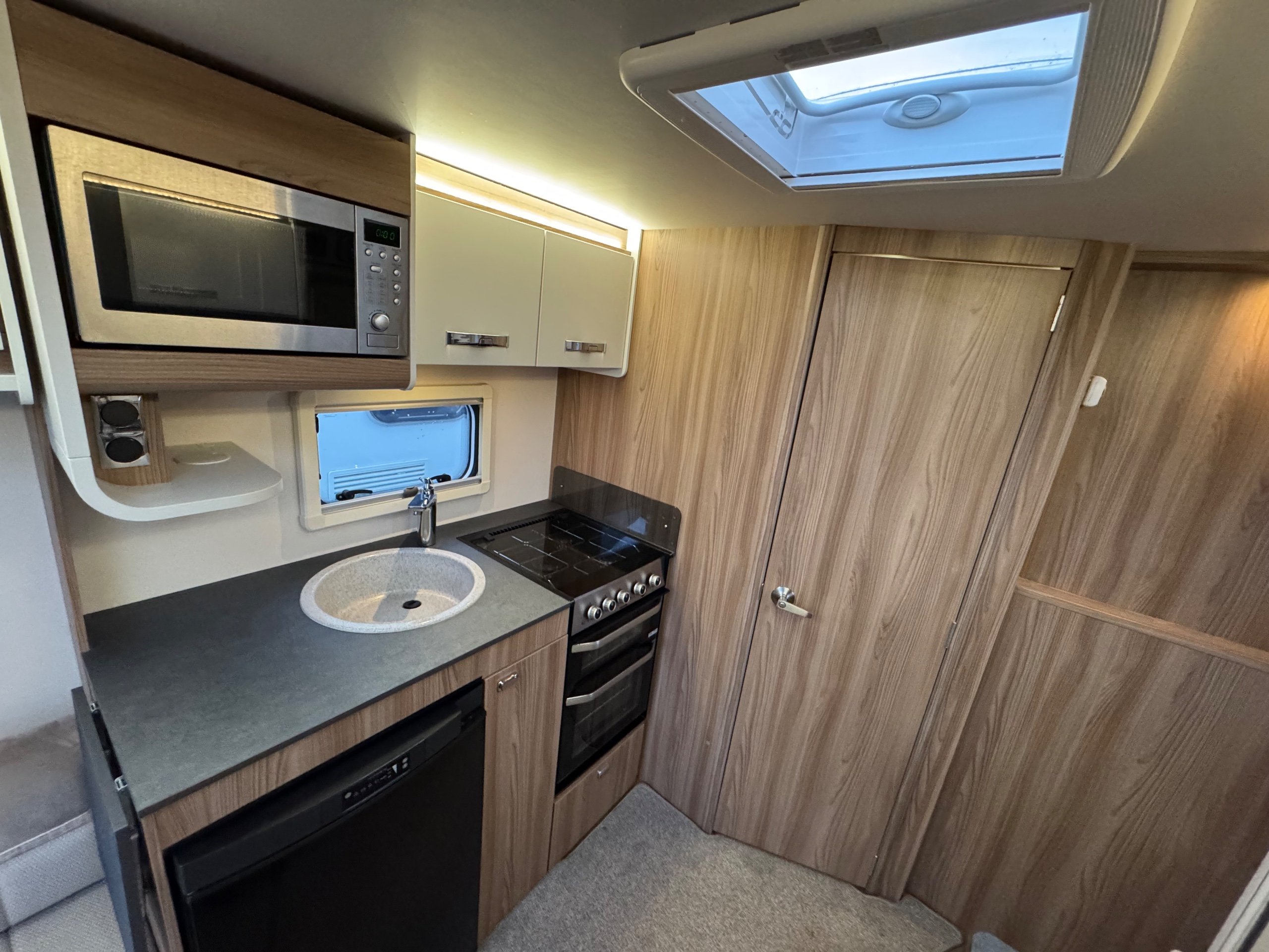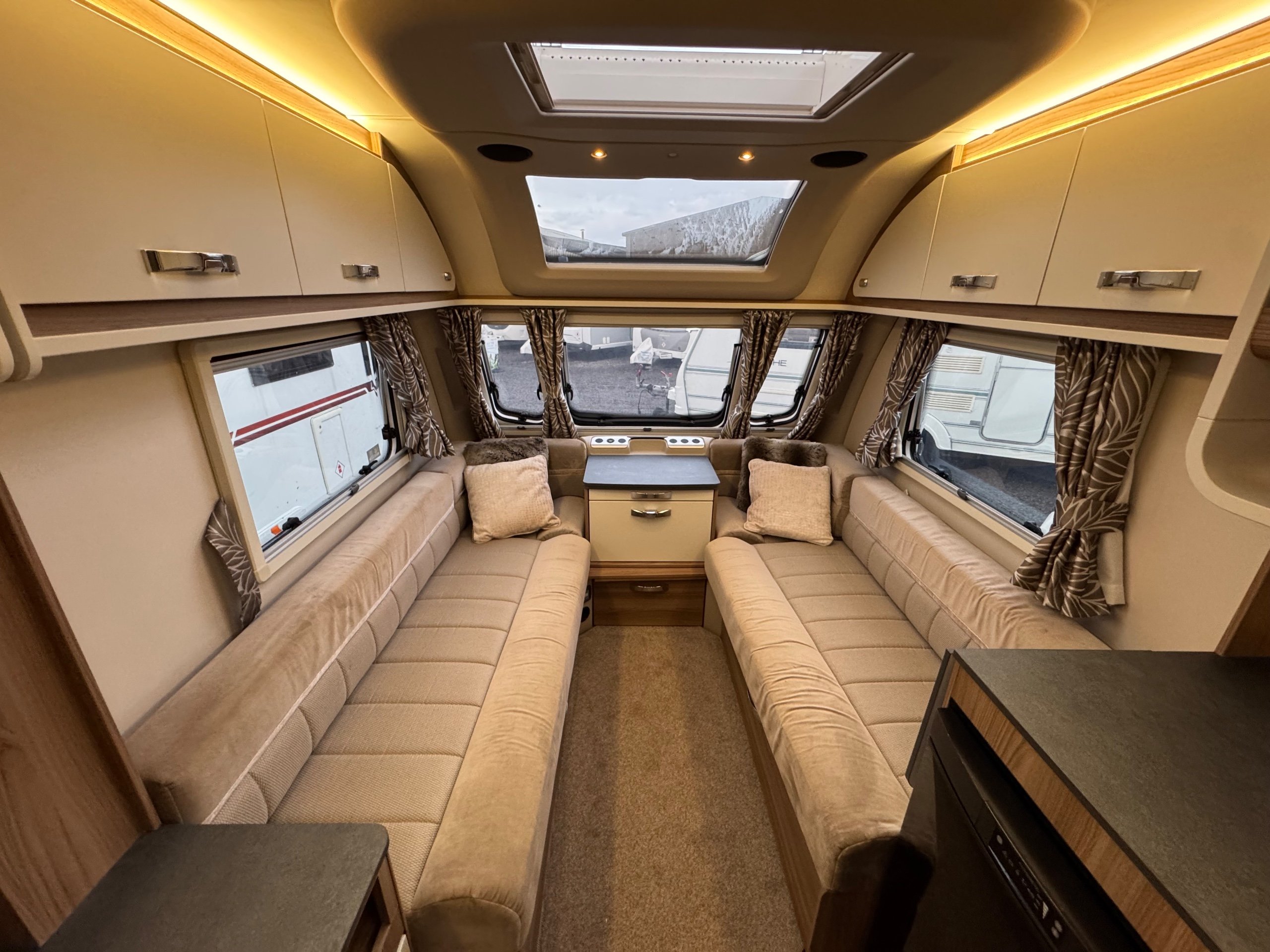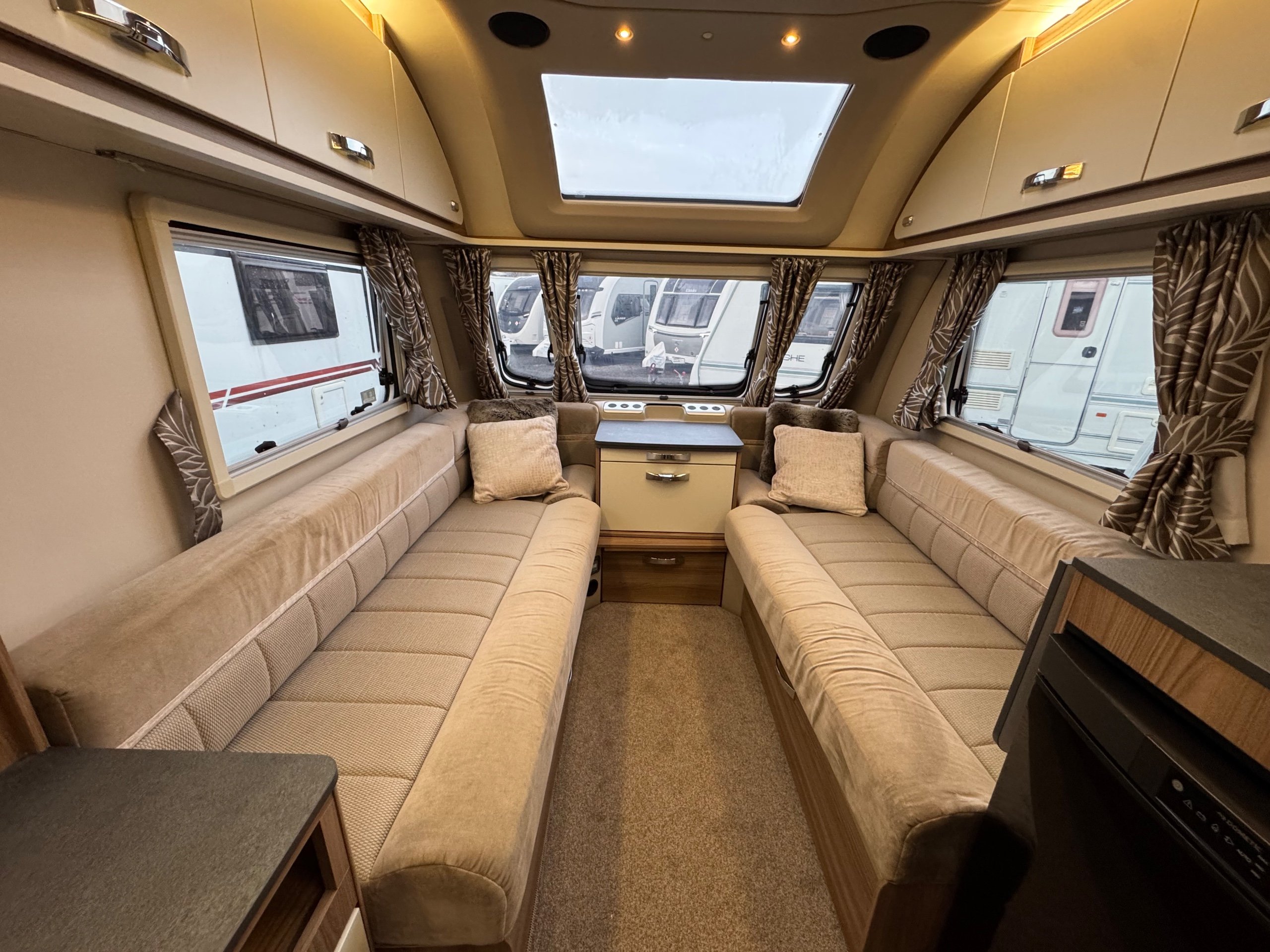 Complete end dressing room including separate shower enclosure, vanity unit, wardrobe and toilet - central nearside dresser - central offside kitchen - 2 x singles / double at the front - an amazing example of this cosy, cute and compact tourer - comparatively lightweight without compromising on specification - in as new condition both inside and out