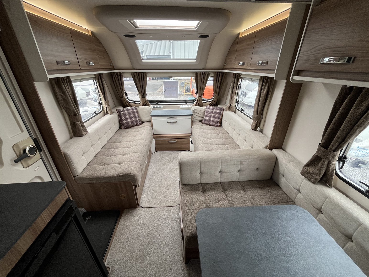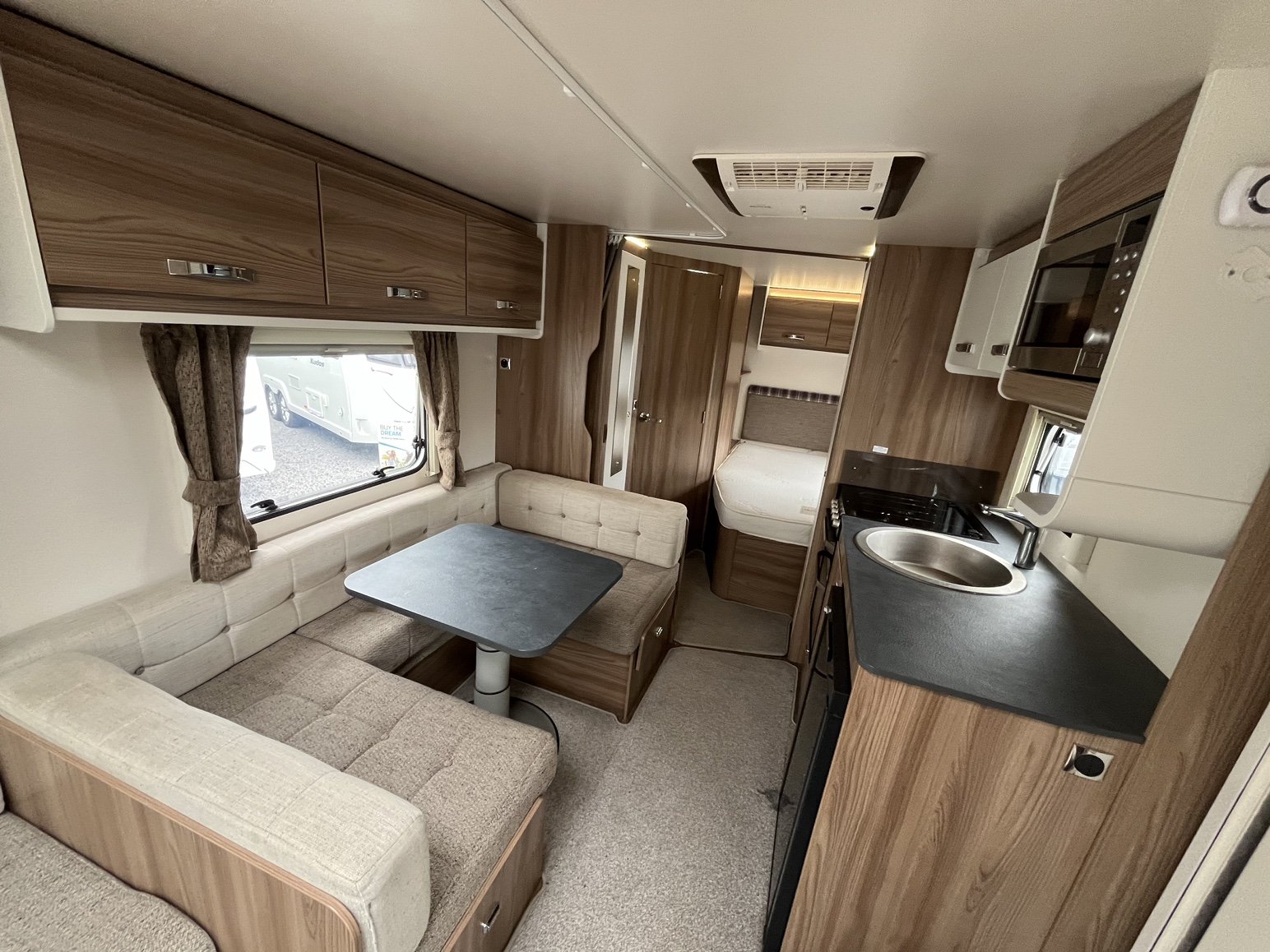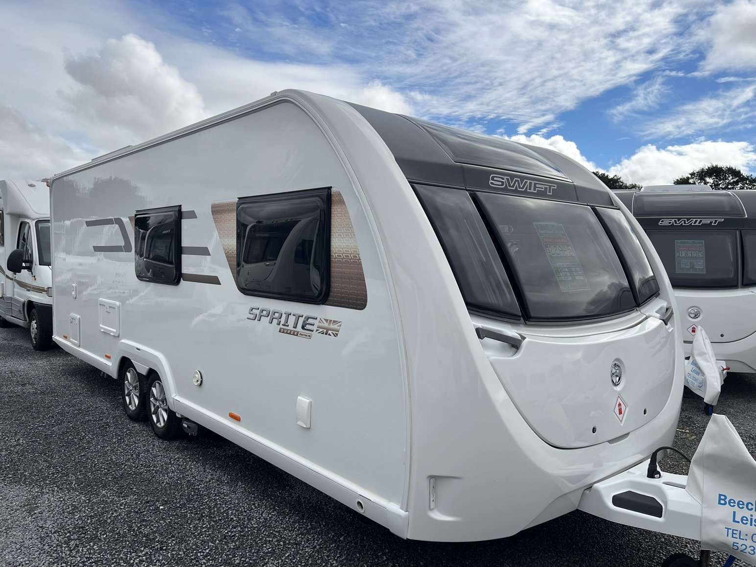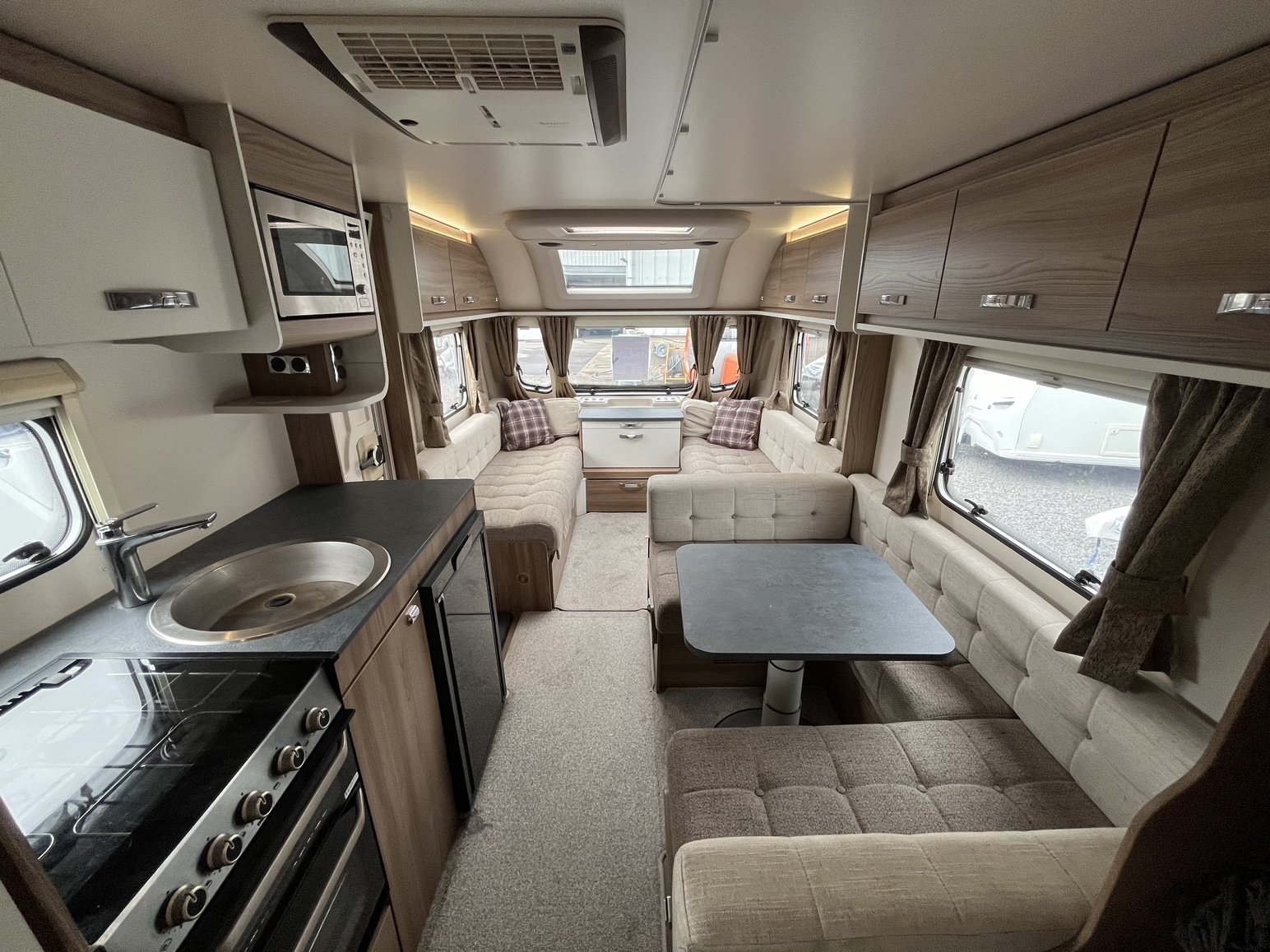 Rear nearside fixed double bed - offside rear dressing room incorporating separate shower enclosure, vanity unit and toilet - central offside 4 person dinette / double bed - central nearside kitchen - 2 x singles / double at the front - - the exceptionally popular Super Sprite is back with this incredible 8 foot wide model - the extra width not only allows more floor space but also for the extra wide front sunroof, which really helps bring the 'outside inside' - benefitting from practical hardwearing materials, low energy LED lights throughout AND FITTED AIR CONDITIONING and unbelievable value for money - one of the most strikingly beautiful and eye catching caravans on the market - the perfect caravan for couples and families alike