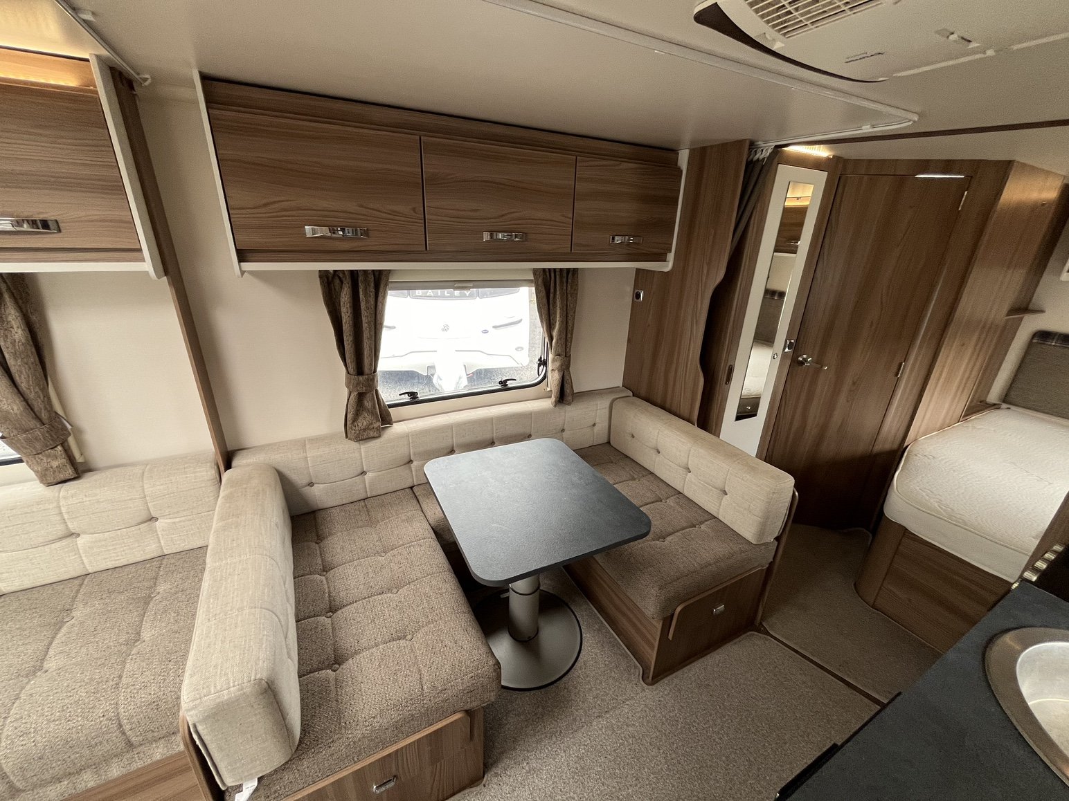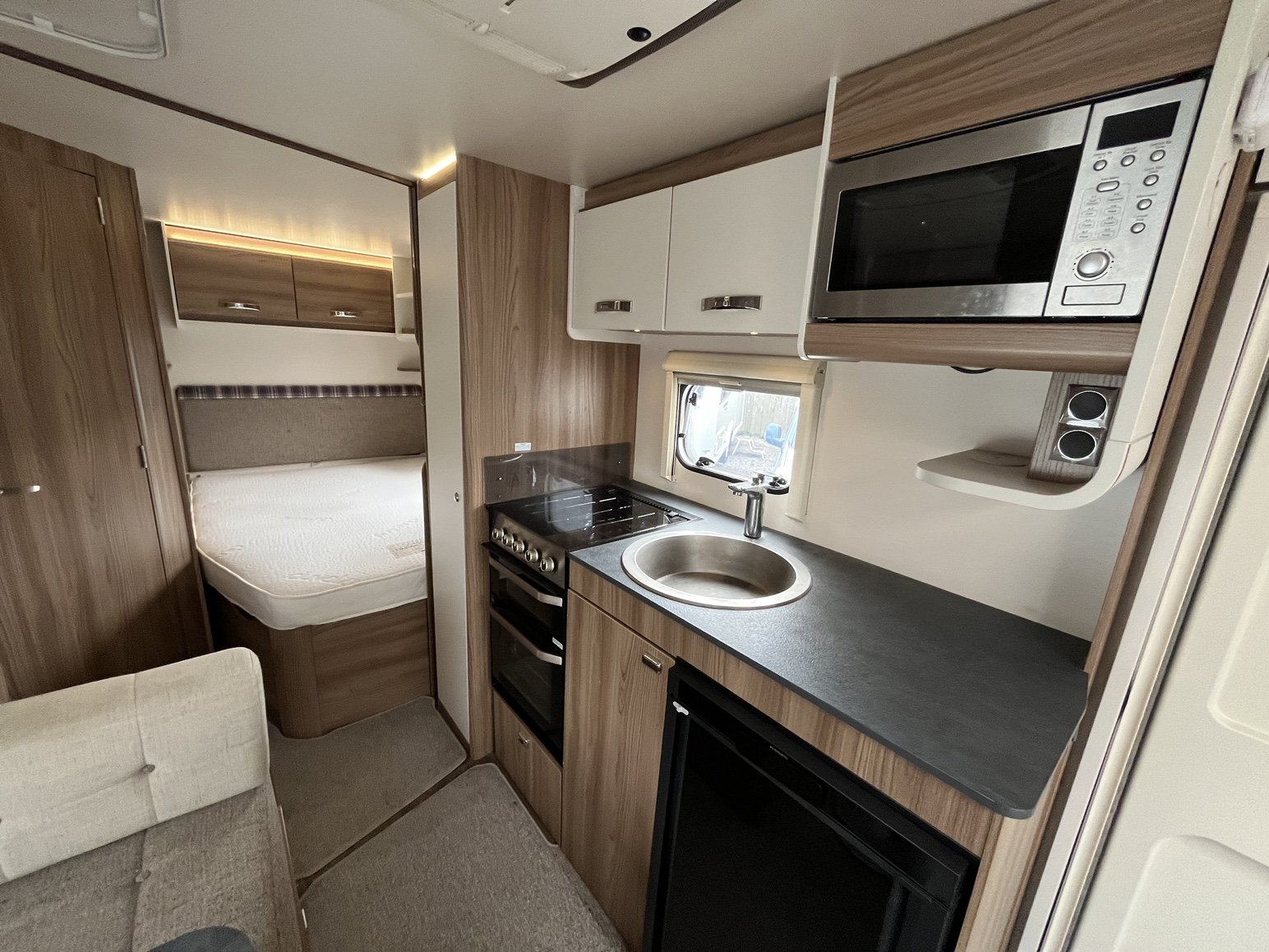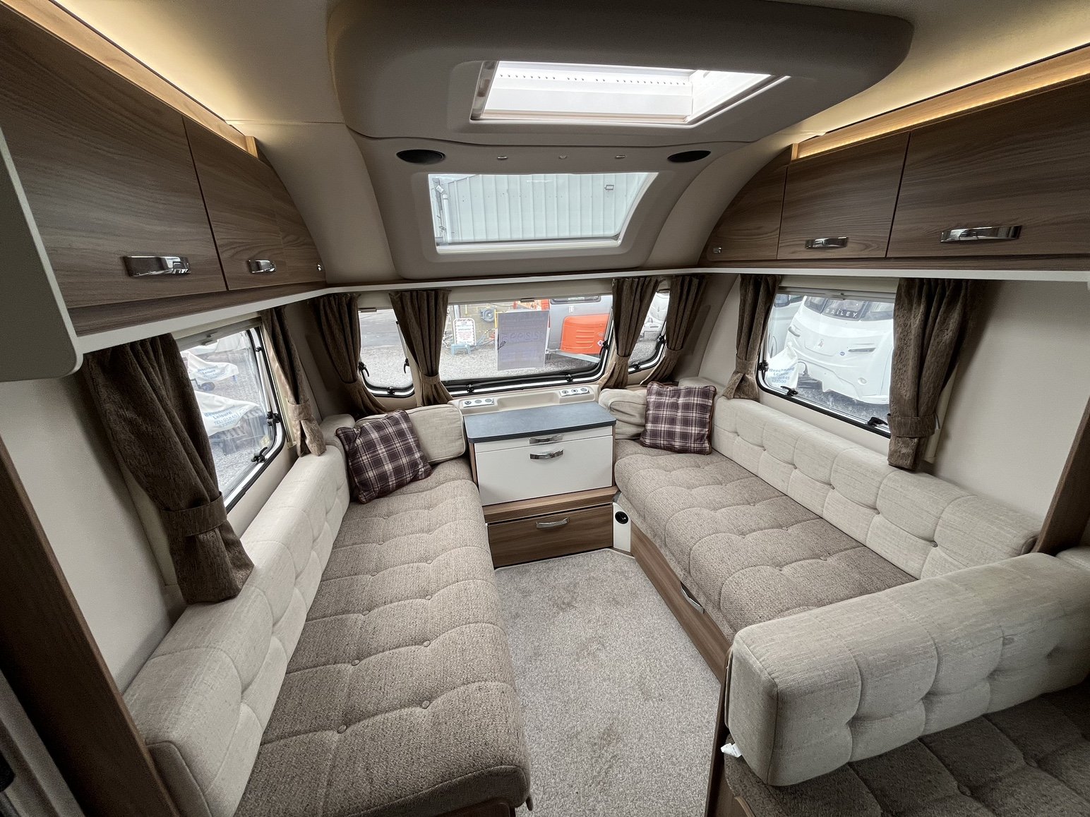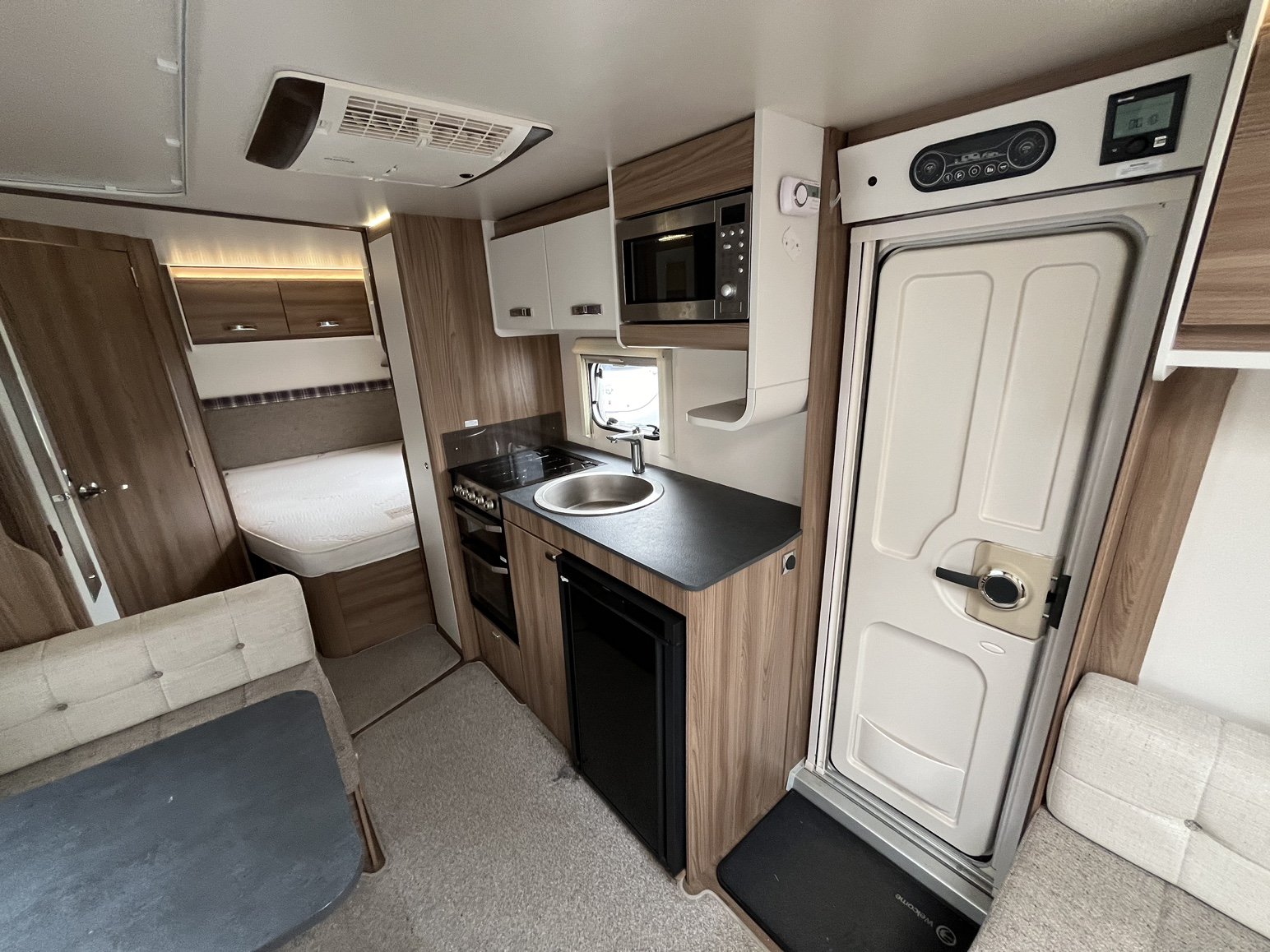 Rear nearside fixed double bed - offside rear dressing room incorporating separate shower enclosure, vanity unit and toilet - central offside 4 person dinette / double bed - central nearside kitchen - 2 x singles / double at the front - - the exceptionally popular Super Sprite is back with this incredible 8 foot wide model - the extra width not only allows more floor space but also for the extra wide front sunroof, which really helps bring the 'outside inside' - benefitting from practical hardwearing materials, low energy LED lights throughout AND FITTED AIR CONDITIONING and unbelievable value for money - one of the most strikingly beautiful and eye catching caravans on the market - the perfect caravan for couples and families alike