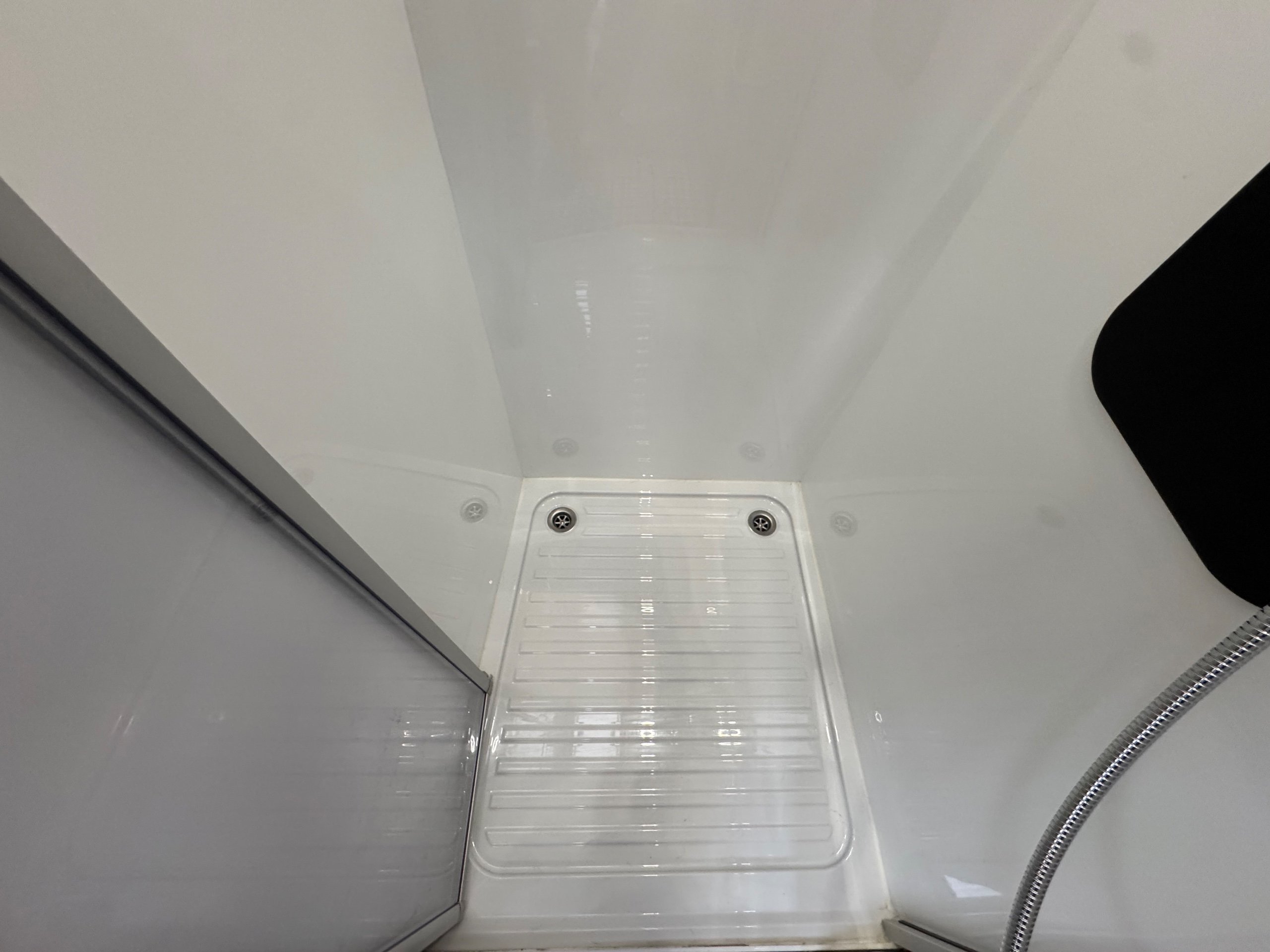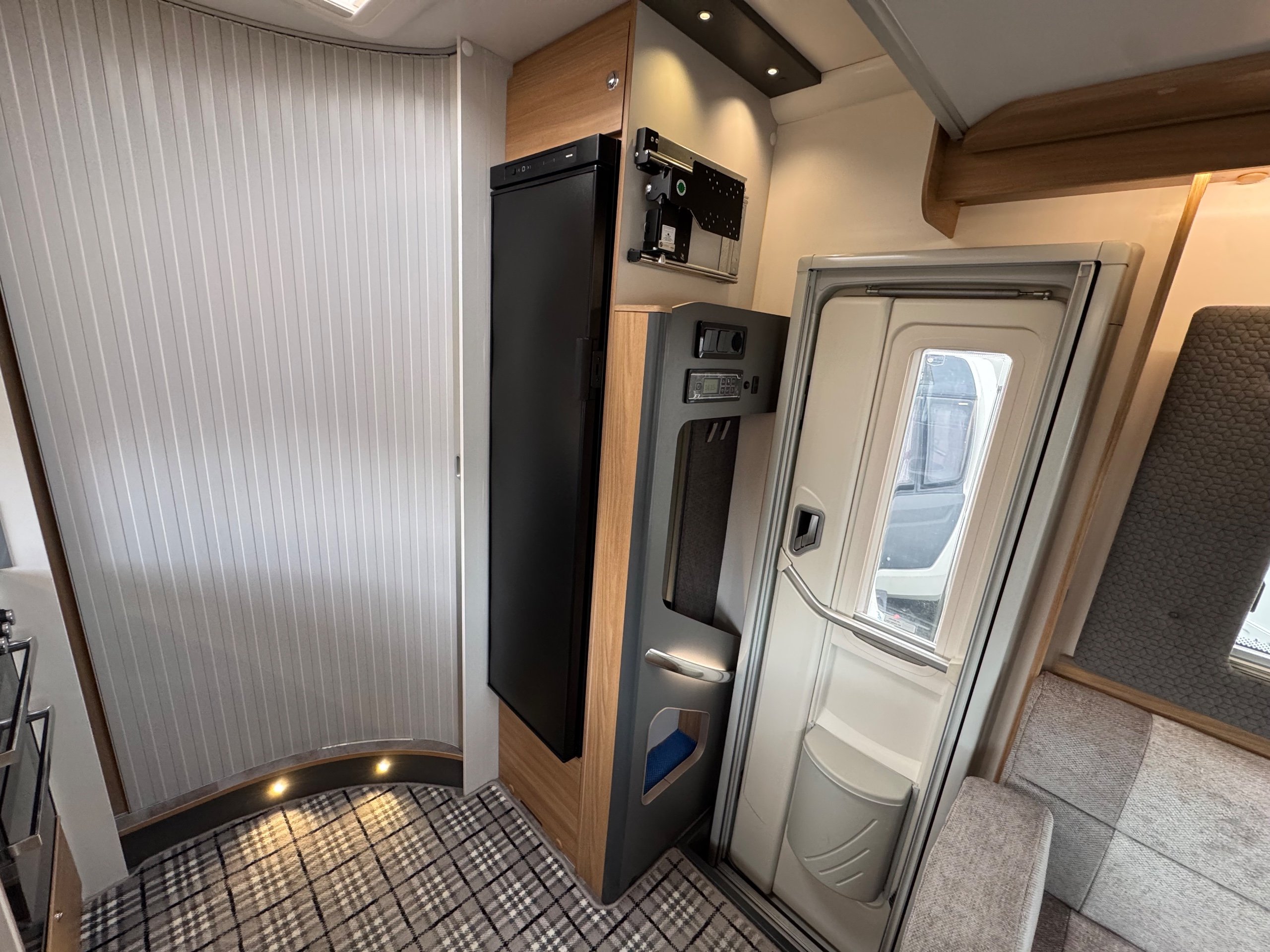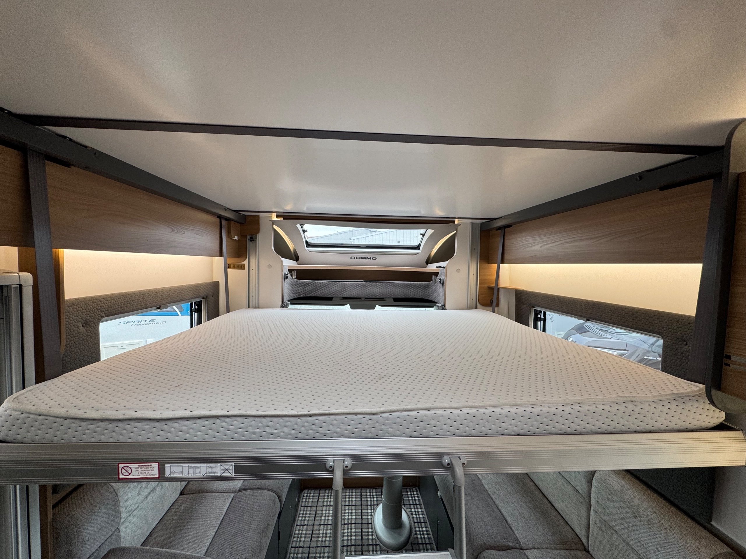 Full rear spacious dressing room incorporating separate shower cubicle, toilet , wardrobes and vanity unit - central offside kitchen benefitting from a tower fridge - central lounge / dining area / double bed with 2 concealed travelling seats - ELECTRIC drop down double bed above