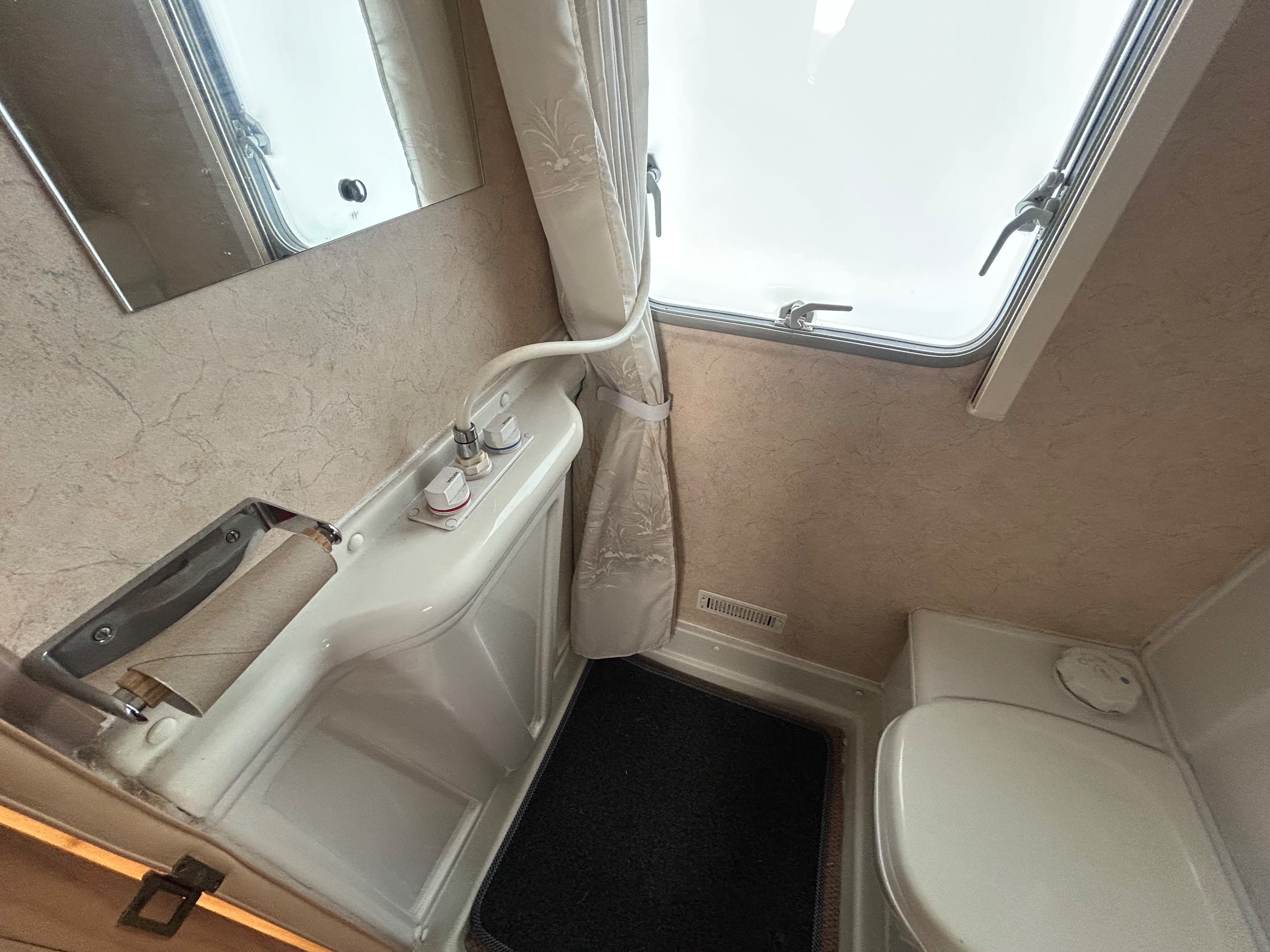 Offside front toilet compartment incorporating an individual shower area, toilet and vanity unit.