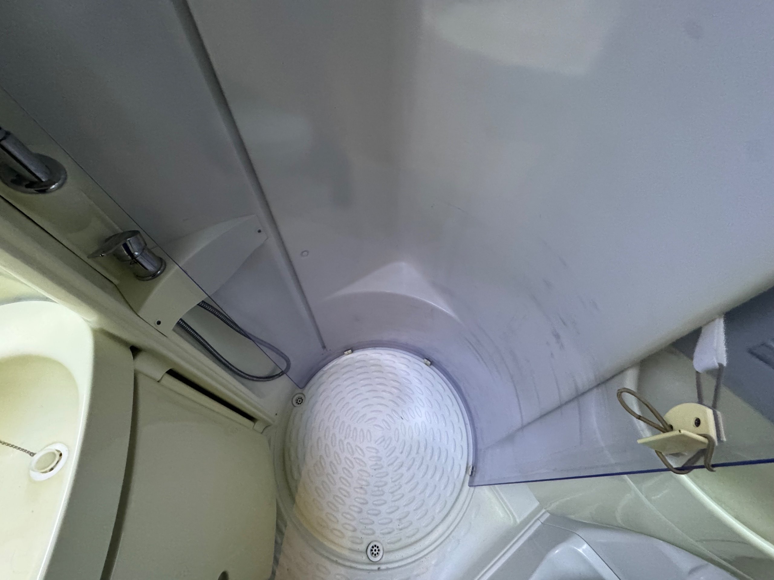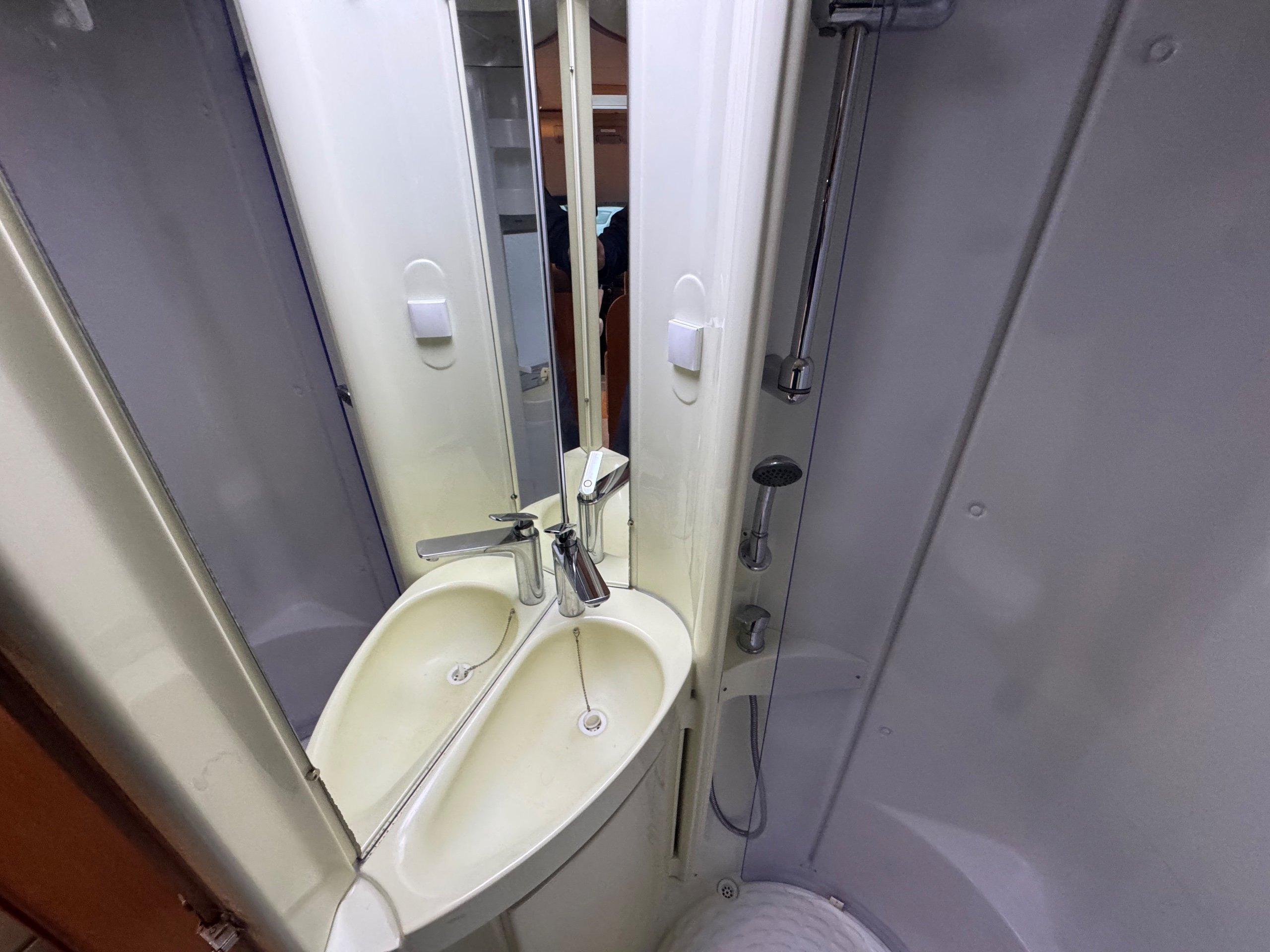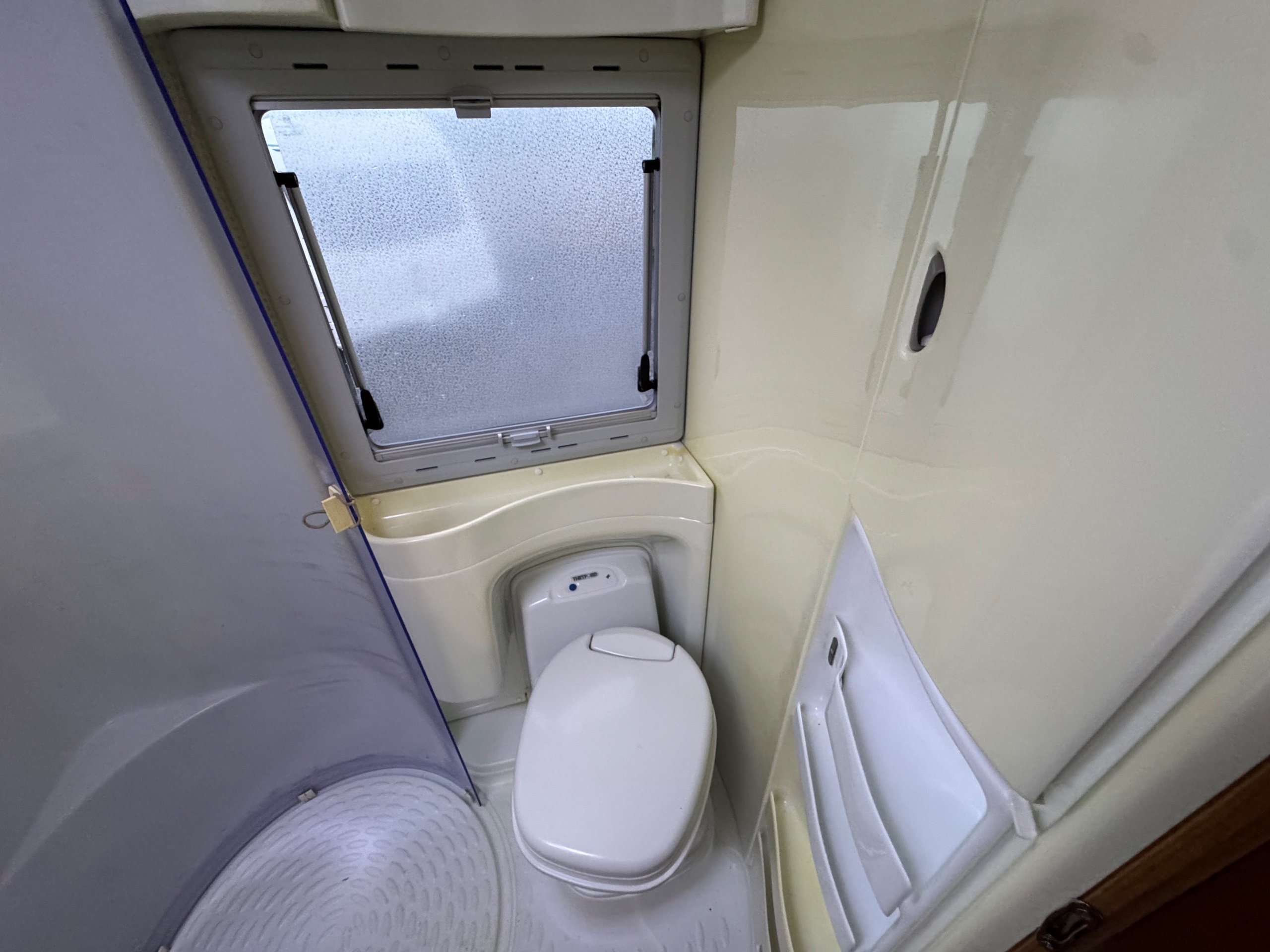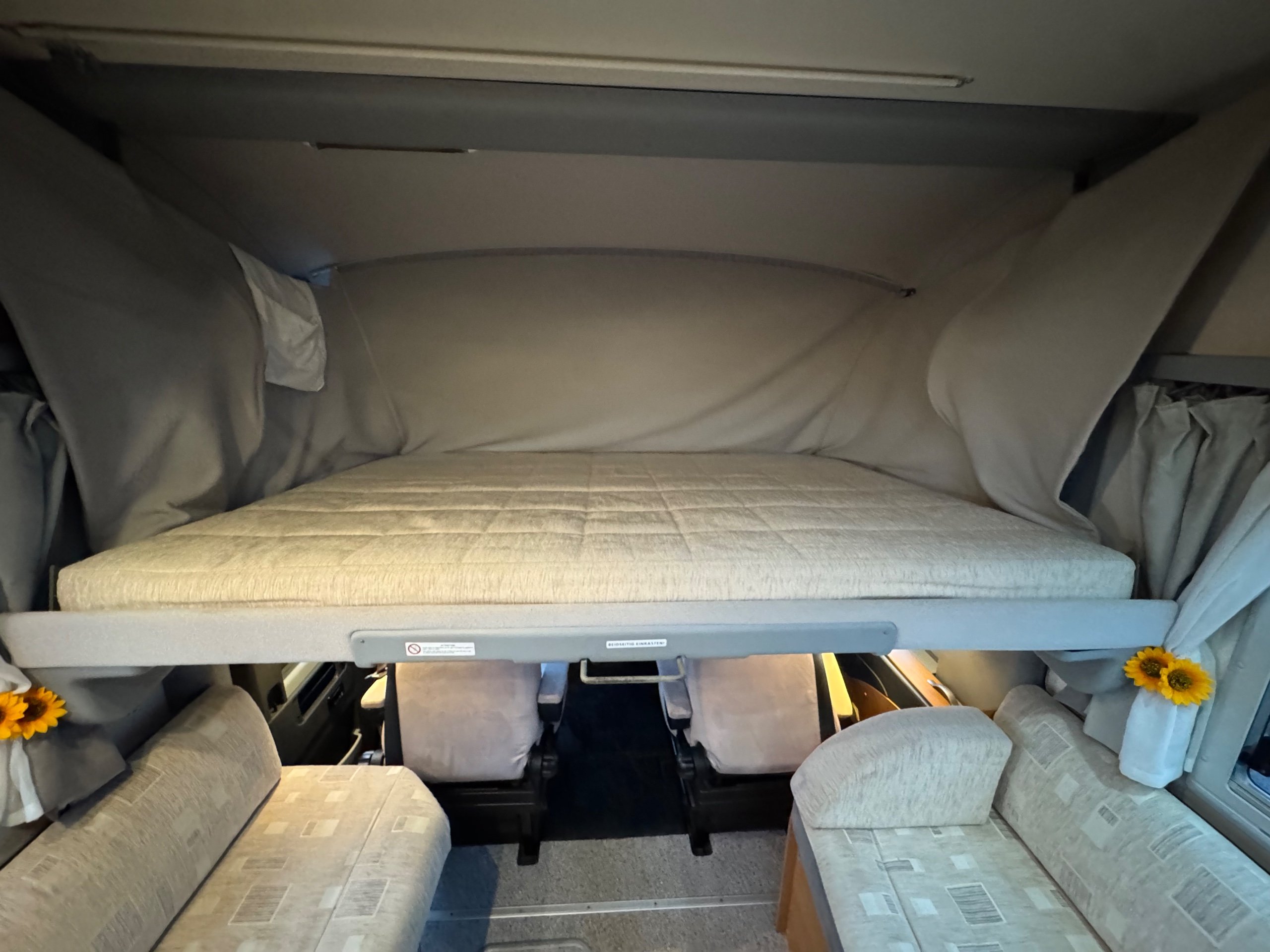 Rear kitchen - nearside rear corner dressing room with separate shower cubicle, toilet and vanity unit - nearside L shape seating with single settee opposite - drop down double bed above the cab .