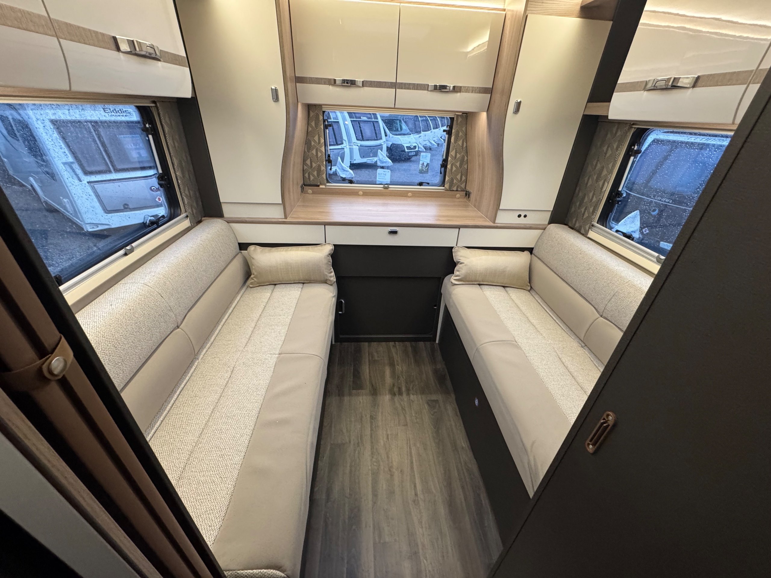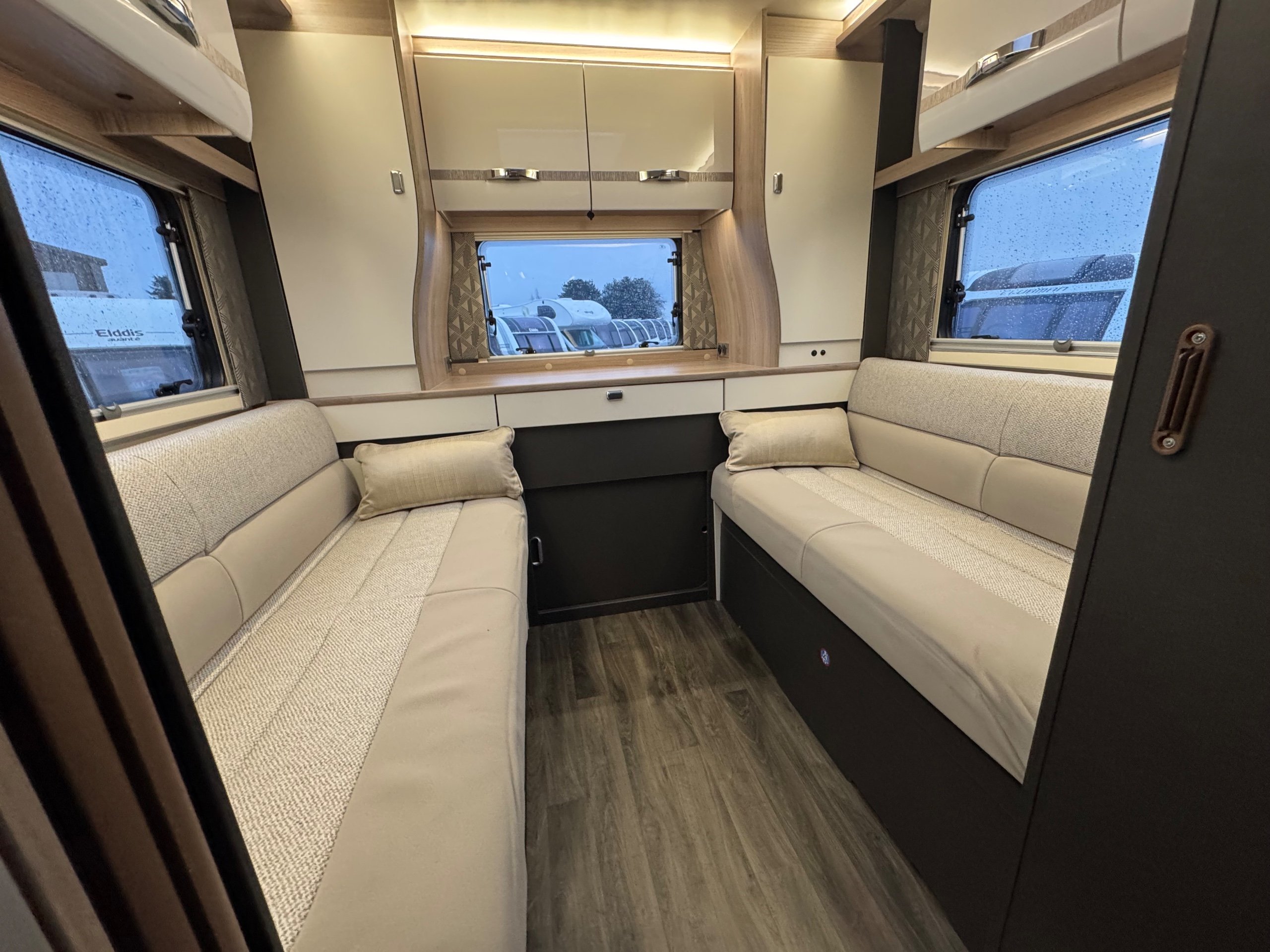 Rear Lounge which converts into a double bed - nearside central dressing room incorporating individual shower cubicle, toilet and vanity unit - central offside kitchen with adjoining double dinette/ lounge/ bed - electric double bed above the dinette.